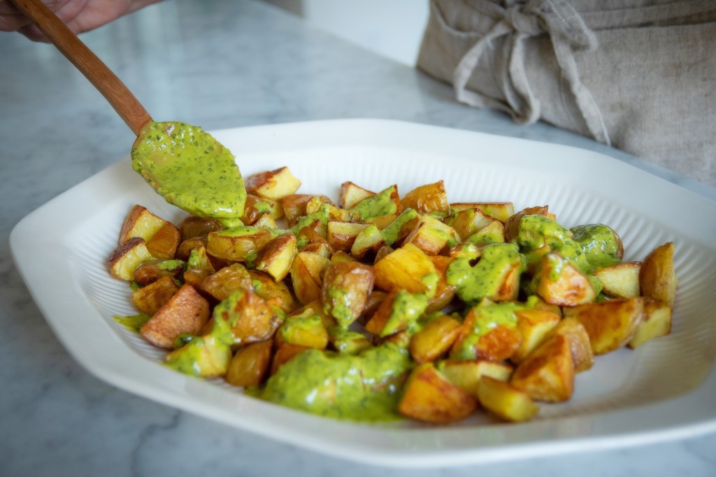For everyone else, here’s a reprint of the recipe. Sometimes just a simple herb sauce is all it takes to elevate a classic comfort dish. Try this with a rotisserie chicken for an easy/fancy spring dinner.