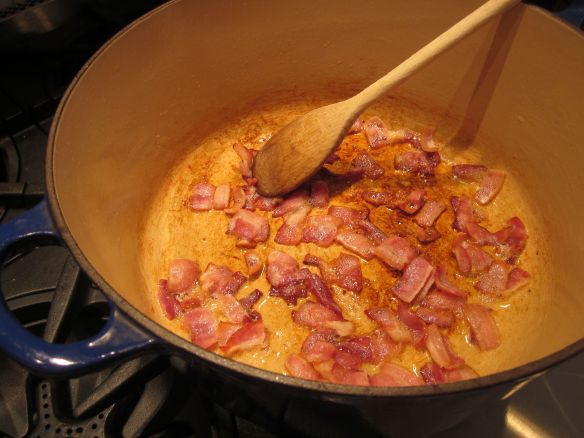 3)   MAKING THE SAUCE: In a large heavy pot or Dutch oven over low heat, cook bacon slices until crisp. If your bacon is lean, you may need to add a splash of olive oil to get the process going.