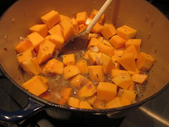 With a slotted spoon, remove cooked bacon and set onto paper towel to drain. Neat freaks (and I say that endearingly): resist the urge to clean the pot. You want all that brown stuff at the bottom. Remove all but 1 Tablespoon bacon drippings from the pan (or add olive oil if there’s not enough). Add shallots/onions to pan and sauté over medium low heat until translucent. Add rosemary and minced garlic and sauté for another minute. Add squash cubes, chicken stock and bouillon cube to pot and bring to boiling.