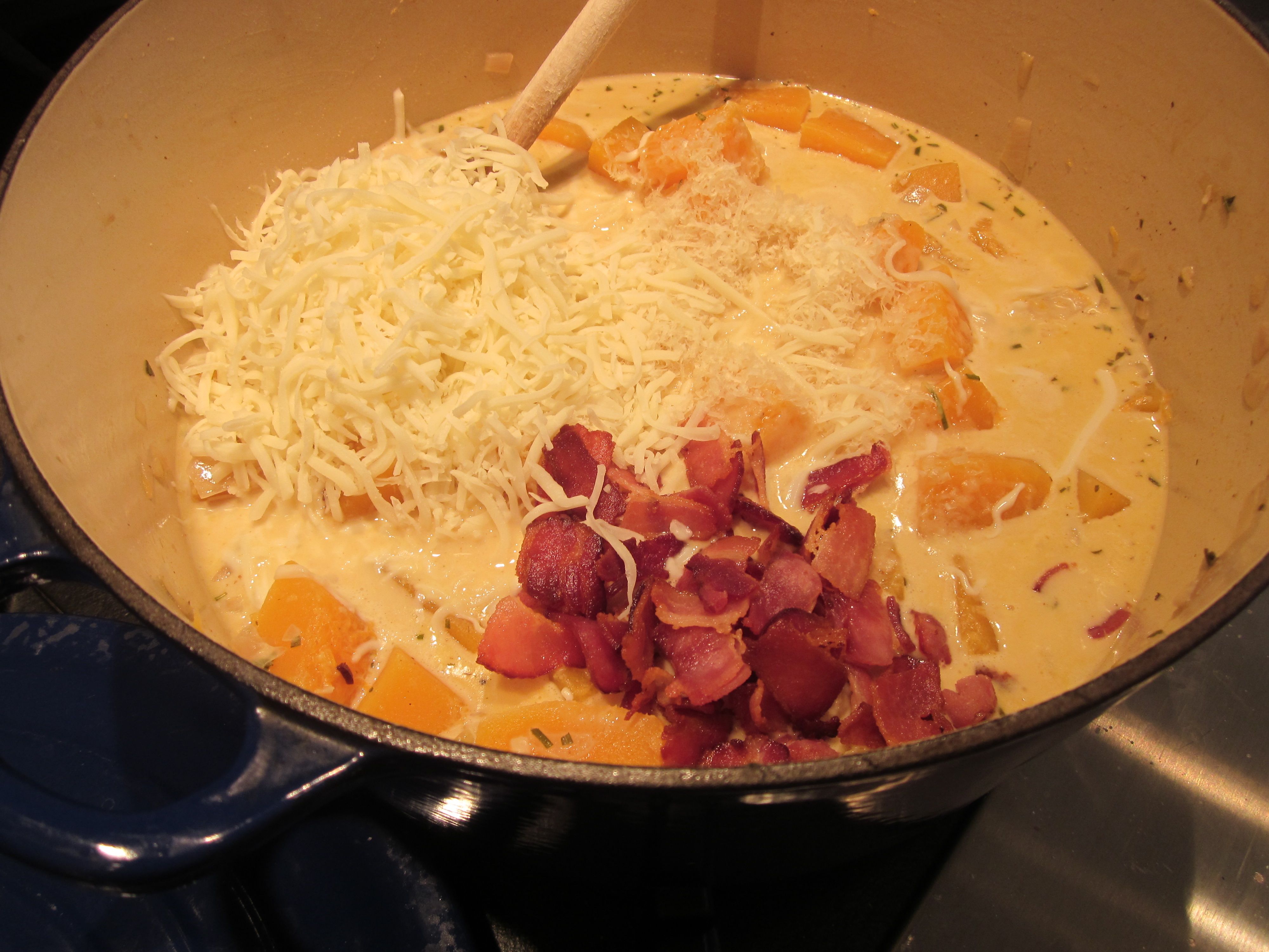4)   ASSEMBLE AND BAKE: Add cooked bacon, mozzarella, all but ½ cup of the Parmigiano, and pasta to the squash sauce. Taste the sauce to see if it needs a little more salt. (Sometimes I will add 1/2 to 1 teaspoon more kosher salt at this point, depending on how salty the cheese was, etc.) Toss gently to coat pasta with the sauce. Pour mixture into a casserole or lasagne dish and top with remaining ½ cup Parmigiano. [If you are making ahead, cover with plastic wrap and refrigerate until ready to bake.]