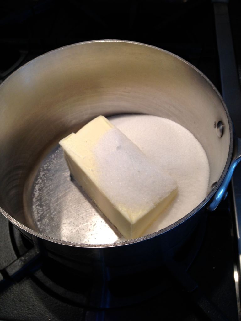 In large heavy saucepan over medium-low heat, melt butter and sugar until fully melted and combined. (Be patient! Melting the butter and sugar over too high of heat will cause the butter to separate and make a big greasy mess.)