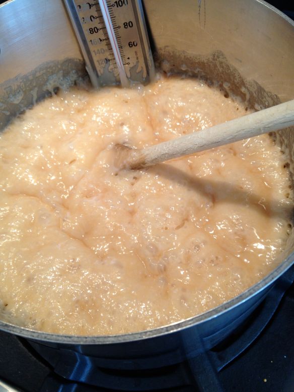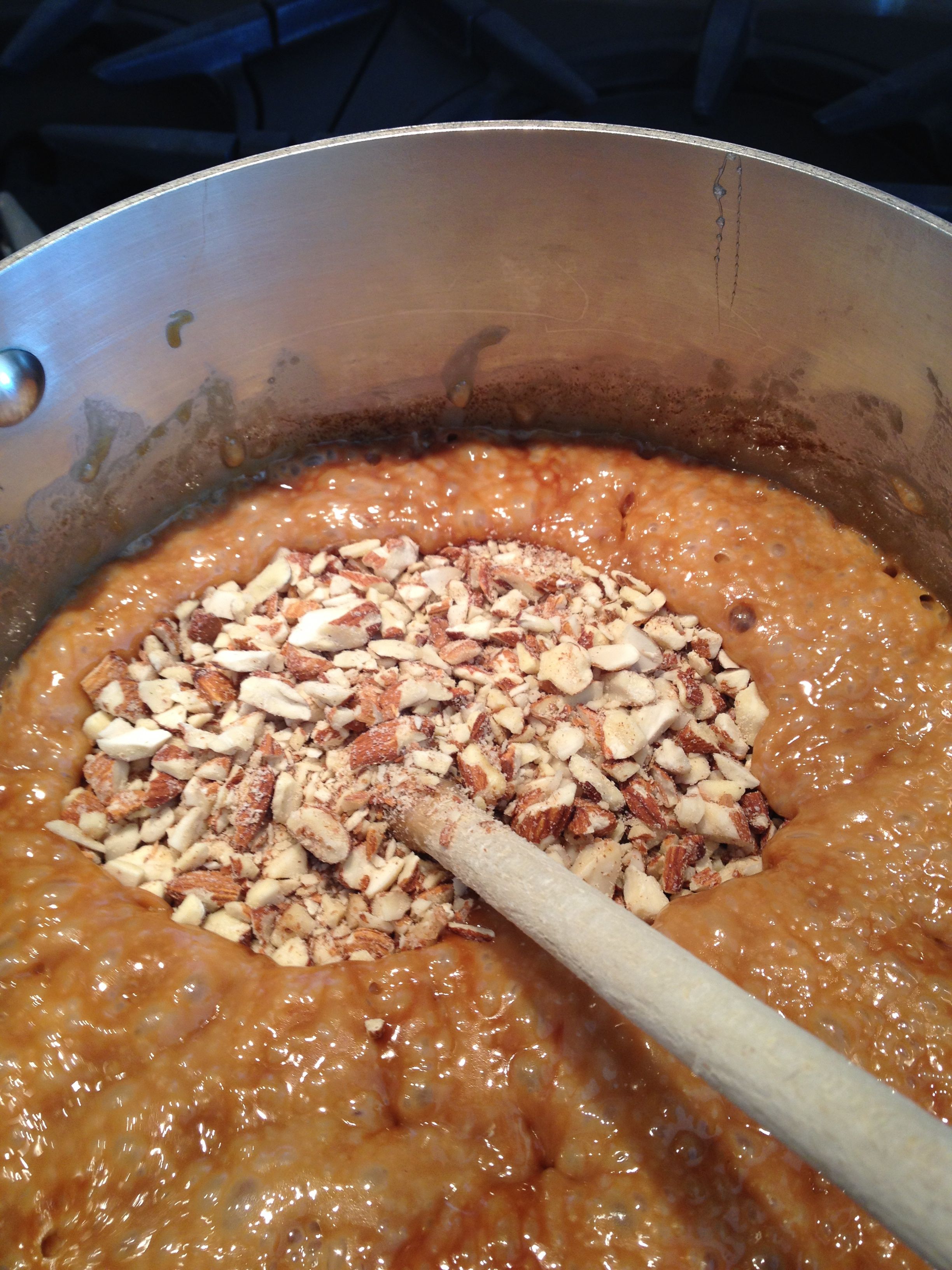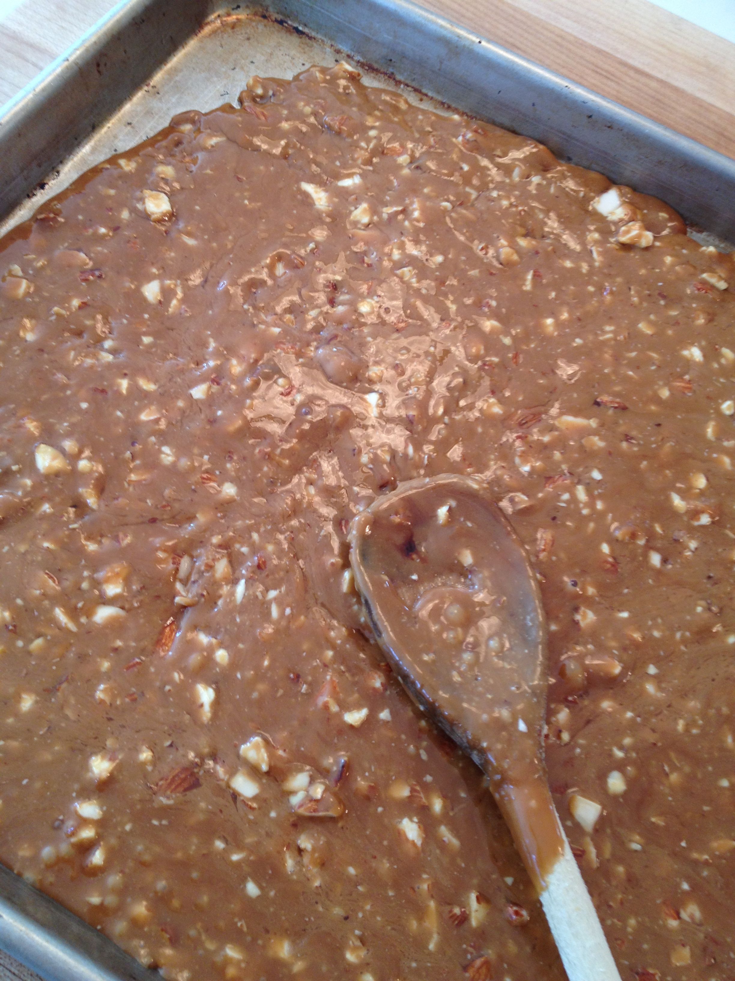 Use wooden spoon to spread/pull mixture – it should almost reach the edges. Caution: this stuff is HOT!