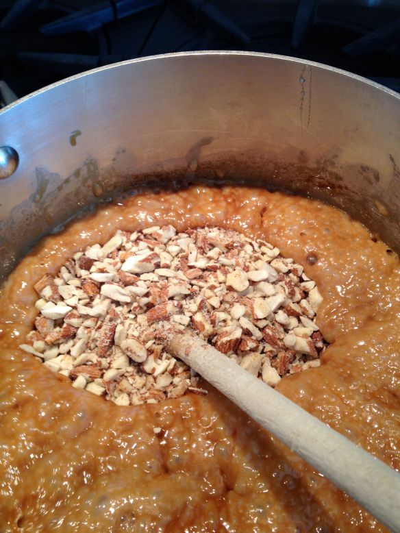 Cook mixture until just shy of 300ºF on a candy thermometer.  Immediately remove from heat and stir in toasted almonds, then pour mixture out onto warmed baking sheet.