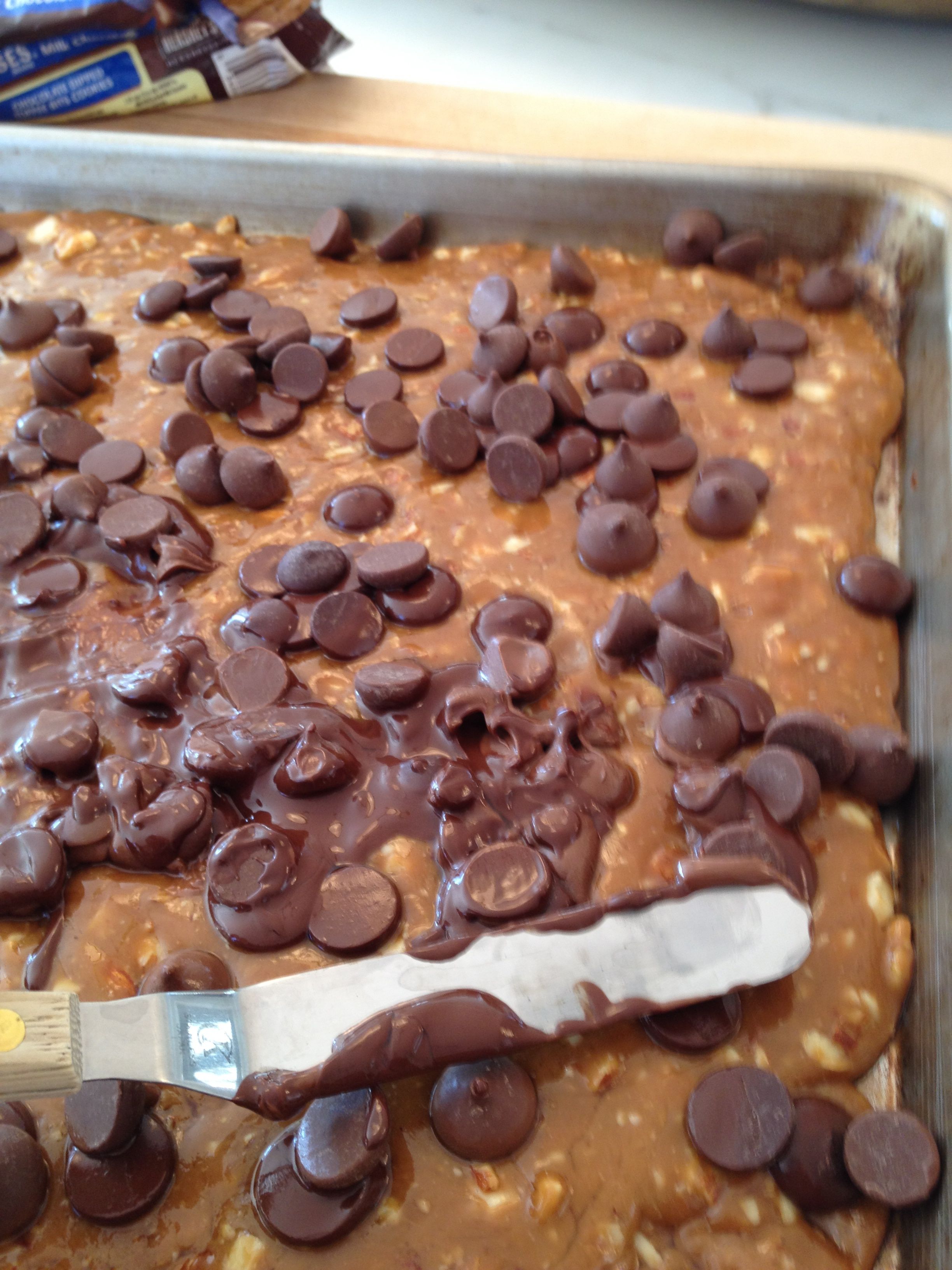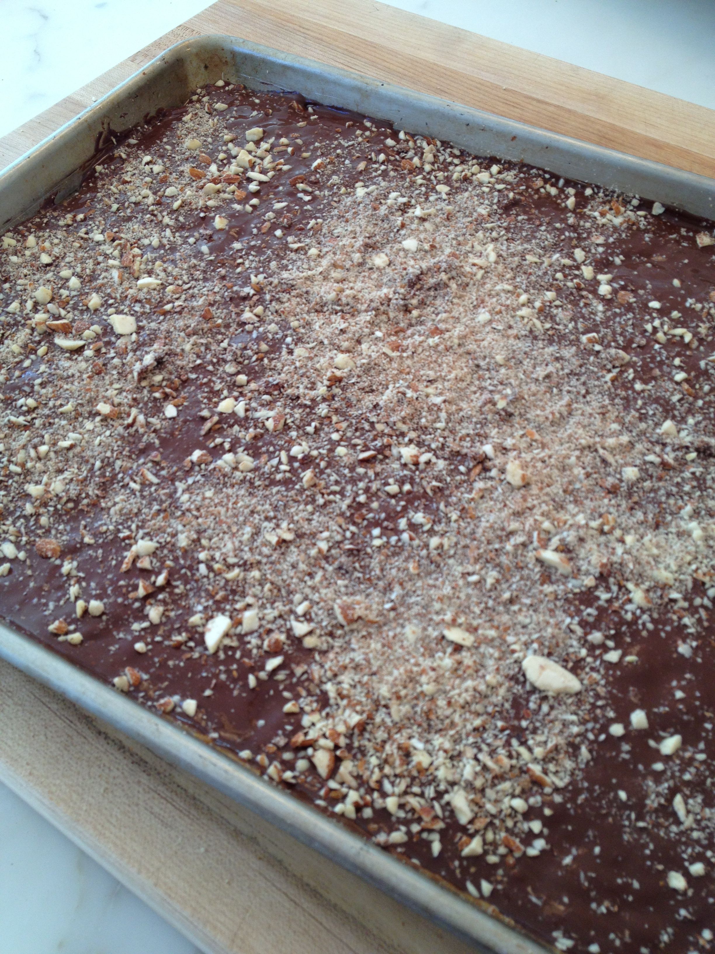 Sprinkle chocolate chips evenly over top of toffee and wait at least 5 minutes for the heat from the toffee to soften the chocolate. Then spread chocolate across top and sprinkle w/reserved almond dust/fine pieces.