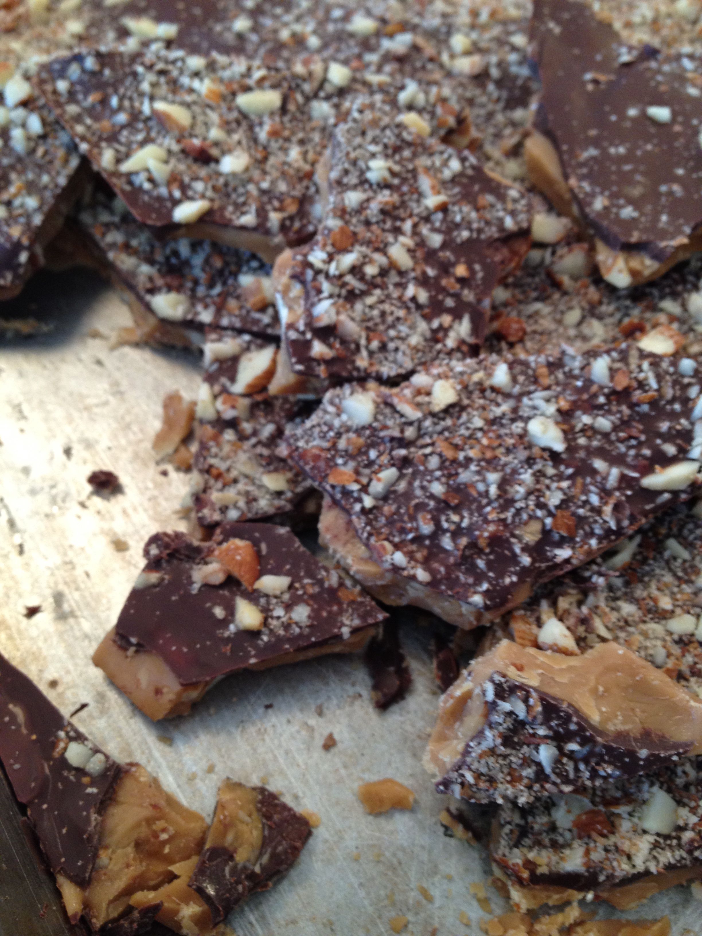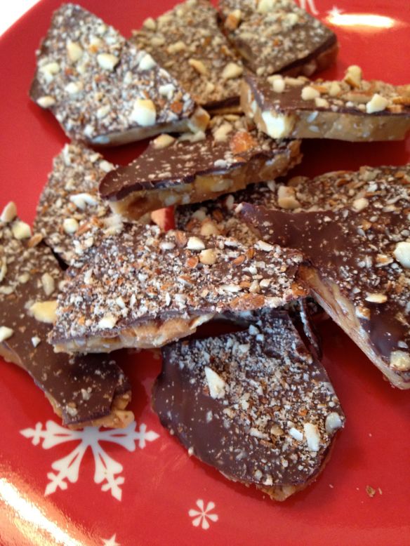 A few years ago I needed a quick, unique, bite-sized dessert to bring to a cocktail party; I dusted off Jen’s recipe, added Hershey’s milk chocolate and more nuts to make it healthier (kidding, sort of), and cranked out my first batch of toffee. It was a disaster. The butter/sugar mixture separated and I ended up with a pool of butter on top of my cooling toffee. I blotted it with paper towels and salvaged it, but it was a humbling experience. It wasn’t until last year that I finally figured out (OK – researched) the trick: Melt the butter slowly! And – warm the nuts and pan. Do this and success is (almost) guaranteed. You’ll never buy canned toffee again.