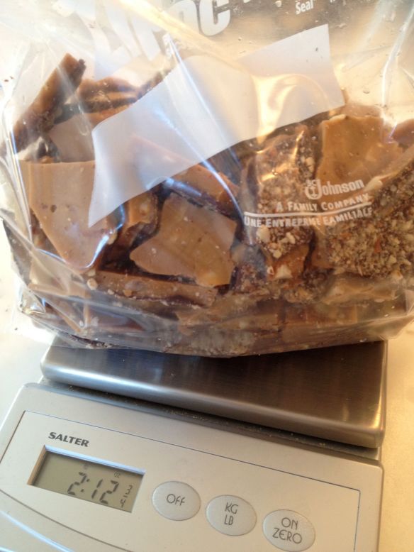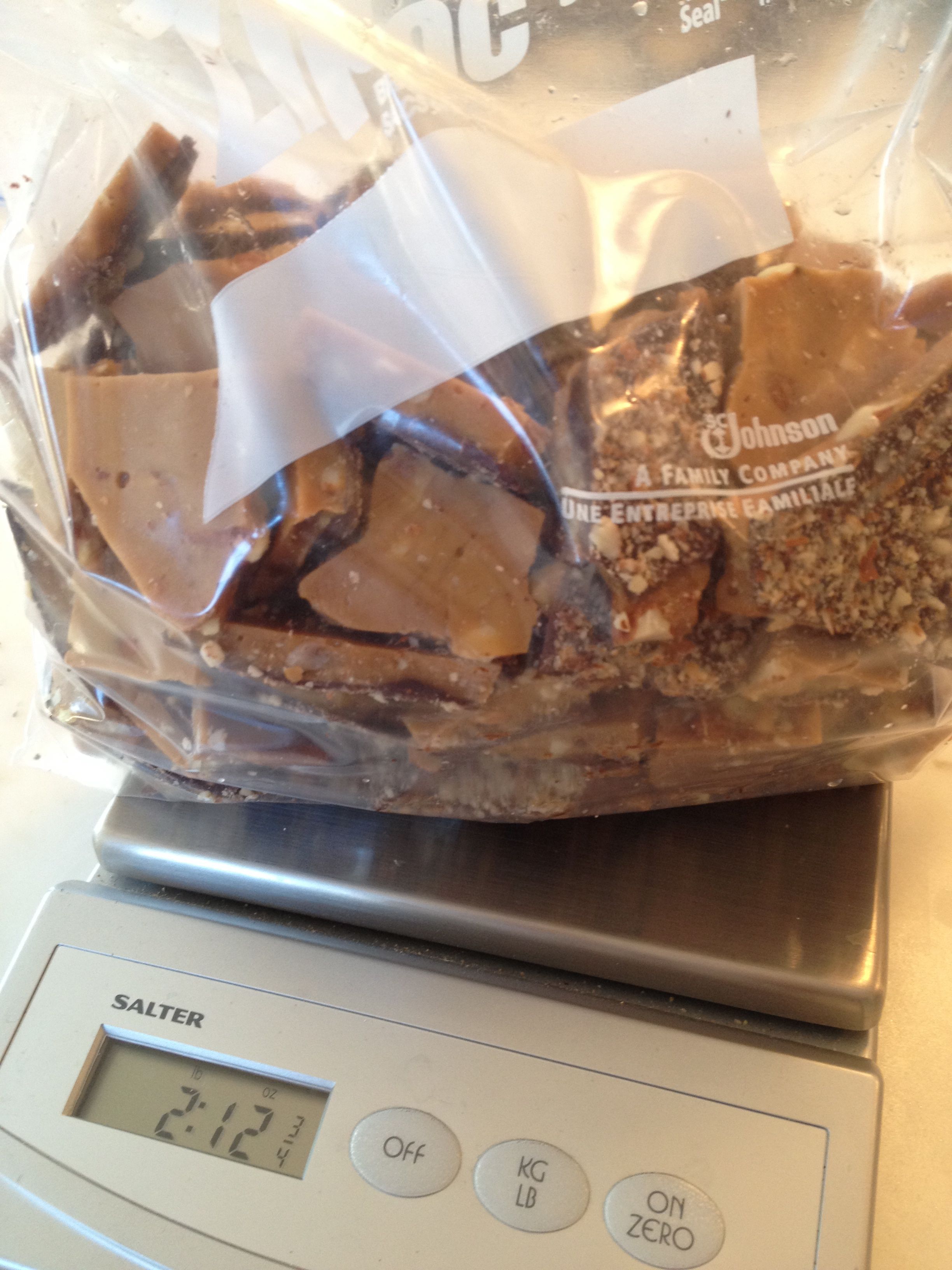 This recipe makes about 2 pounds of finished toffee. It will keep for months in the freezer, unless you have weak willpower. Then I’d give it a few days at best.