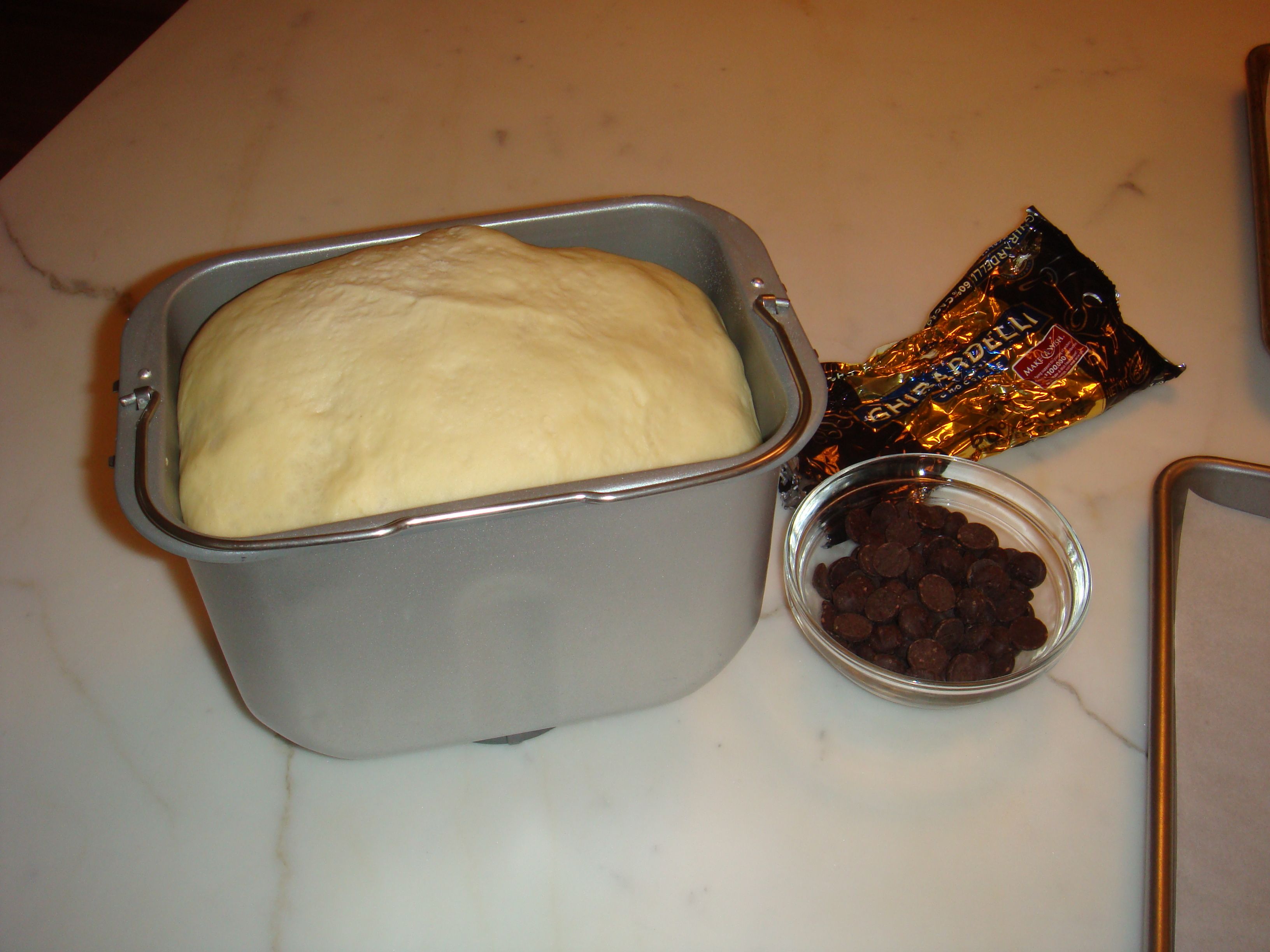 Usually I make the dough for these buns in a bread machine – fast and foolproof. Just dump all the ingredients (except for the chocolate chips) into the bread machine bowl, set to “Dough” cycle and walk away. After about 90 minutes, the dough’s ready to form into balls or be refrigerated until ready to use. Since not everyone has a bread machine lying around, this morning I tried making the dough with an electric mixer and dough hook. It took a little more “active time”, but the results were just as good. And for a fully unplugged and highly therapeutic version, you could mix and knead the dough entirely by hand, using the week’s frustrations to power the process. (Trying to get blue Gak out of beige carpeting comes to mind.)