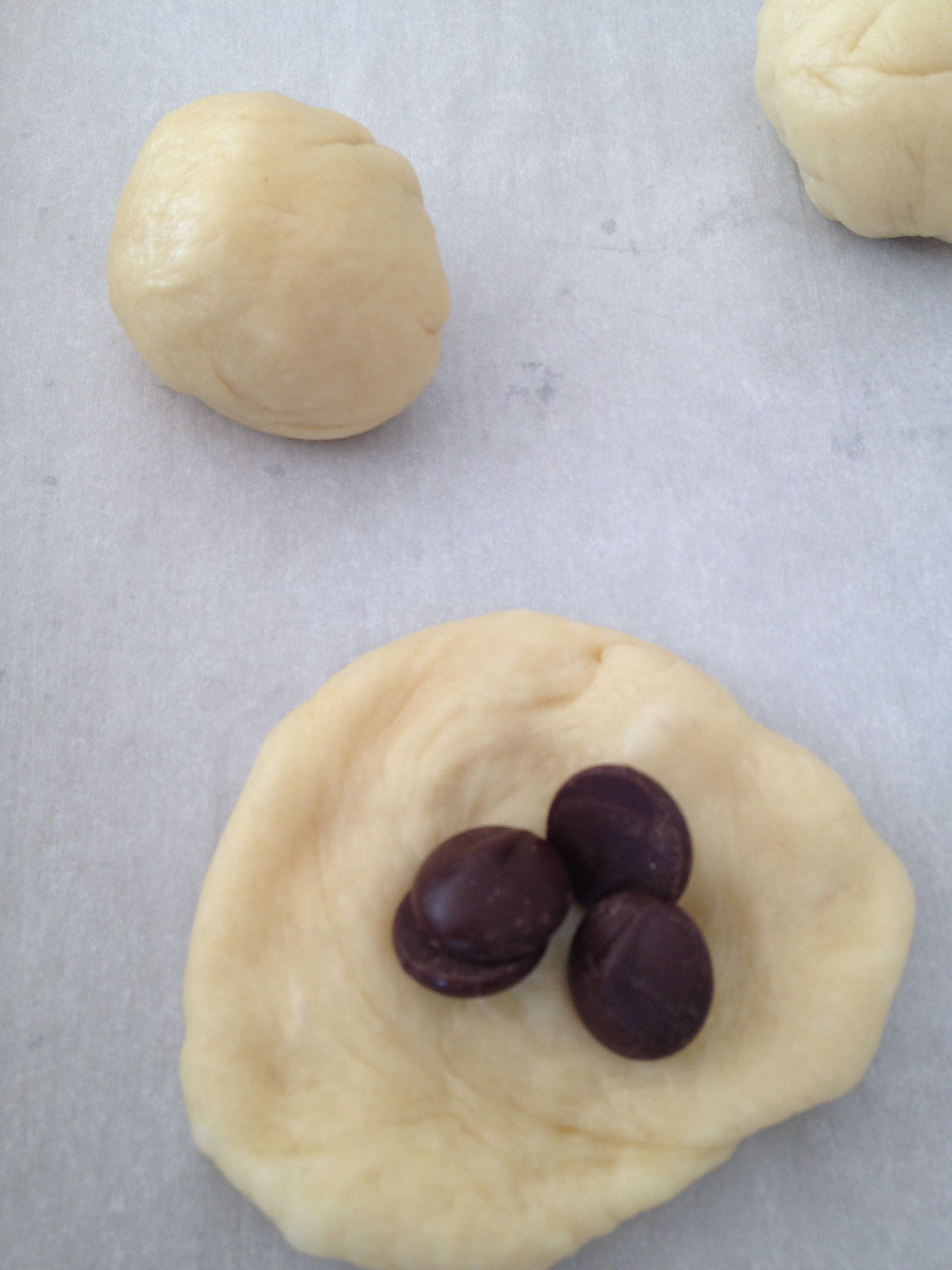Heat oven to 375ºF (or 350º for convection). Line two baking sheets with parchment paper. Pull off pieces of dough and form into little balls, between walnut and golf ball size. (You should get 28-30 balls in total.) Flatten the balls into silver dollar size pancakes (the old silver dollars, not the confusing quarter-sized ones). Place 4-5 chocolate chips in the center of the dough circles, then pull up the sides of the dough and pinch to seal. Place balls pinched-side down on the baking sheets.