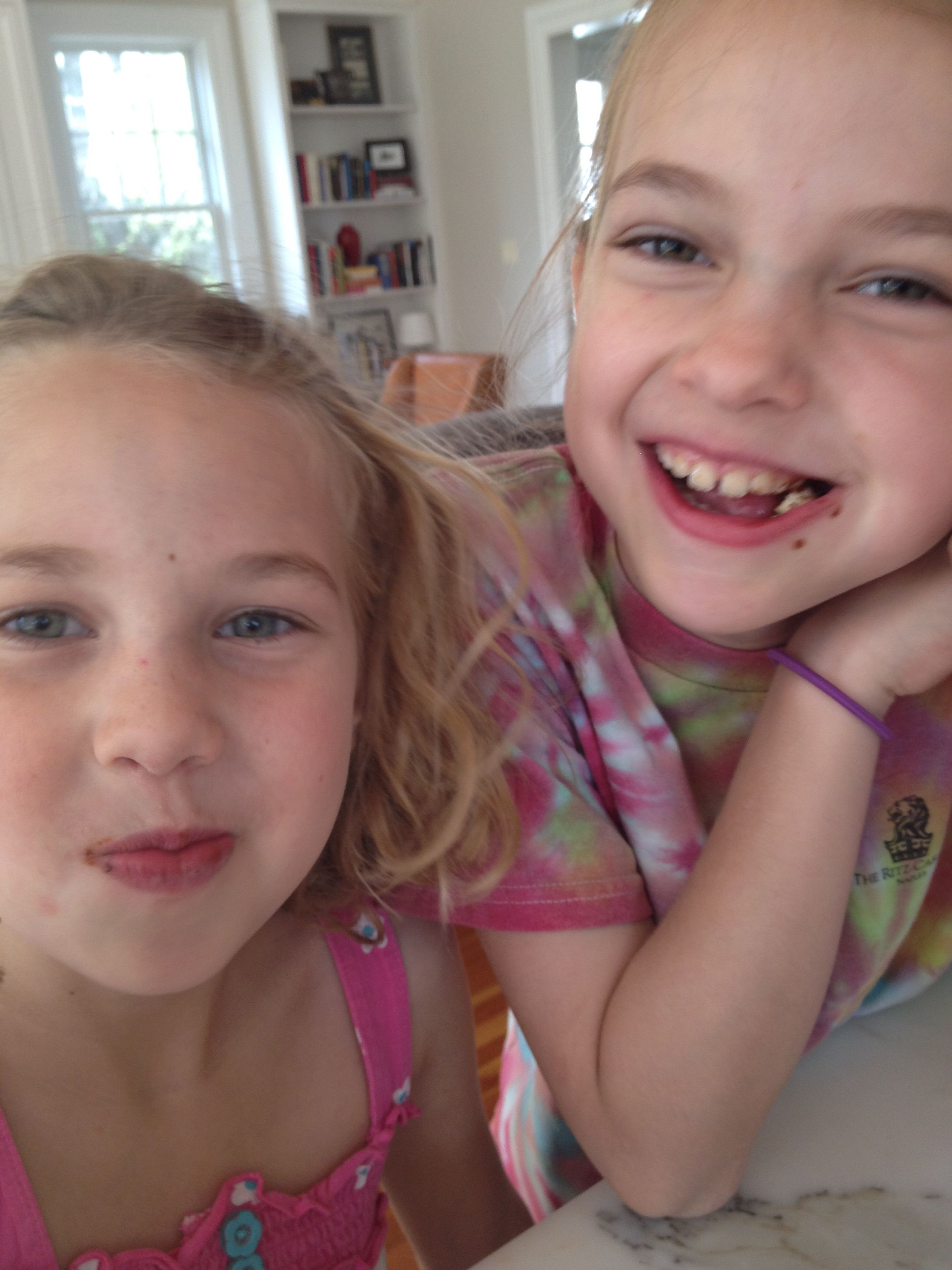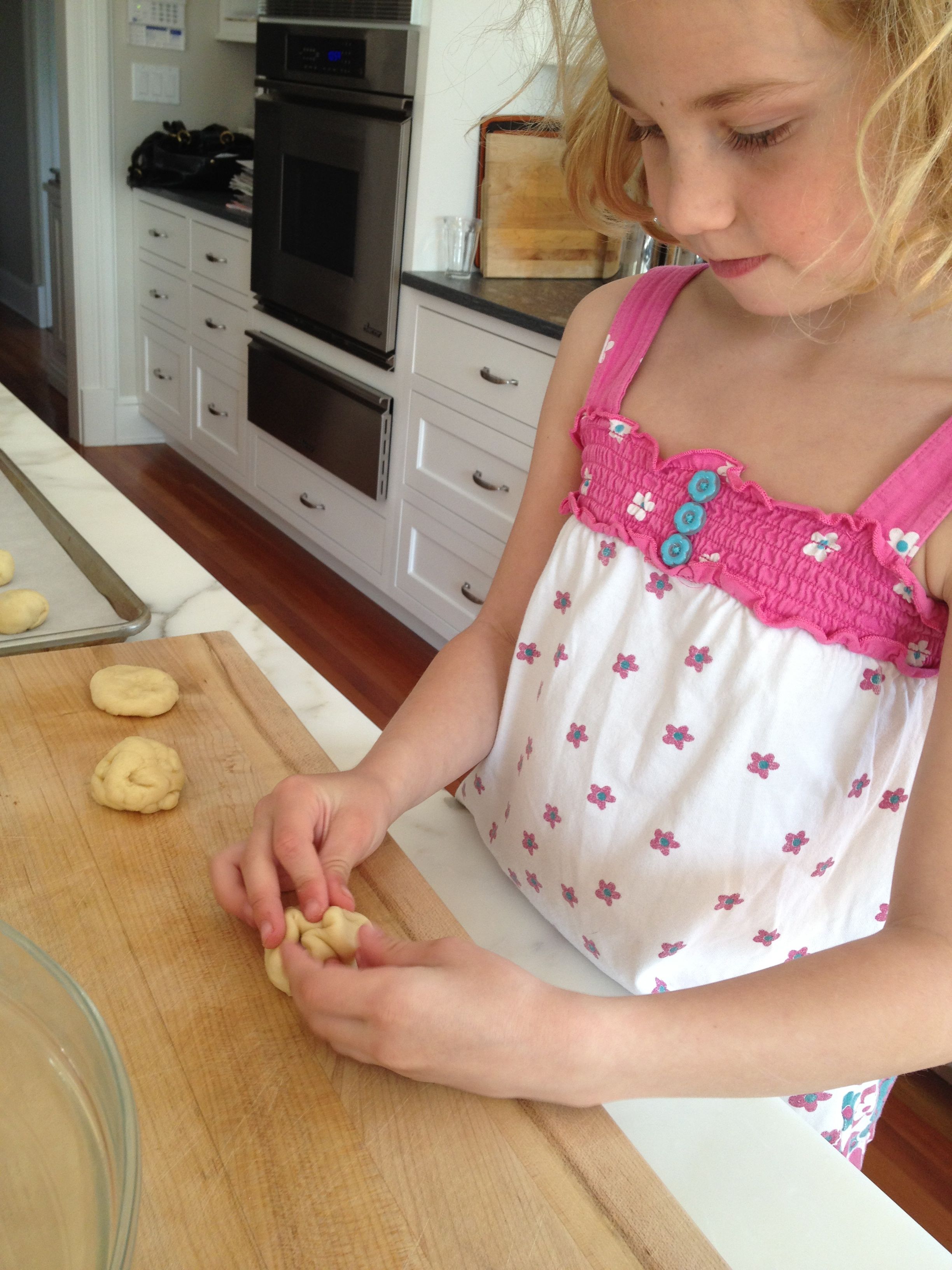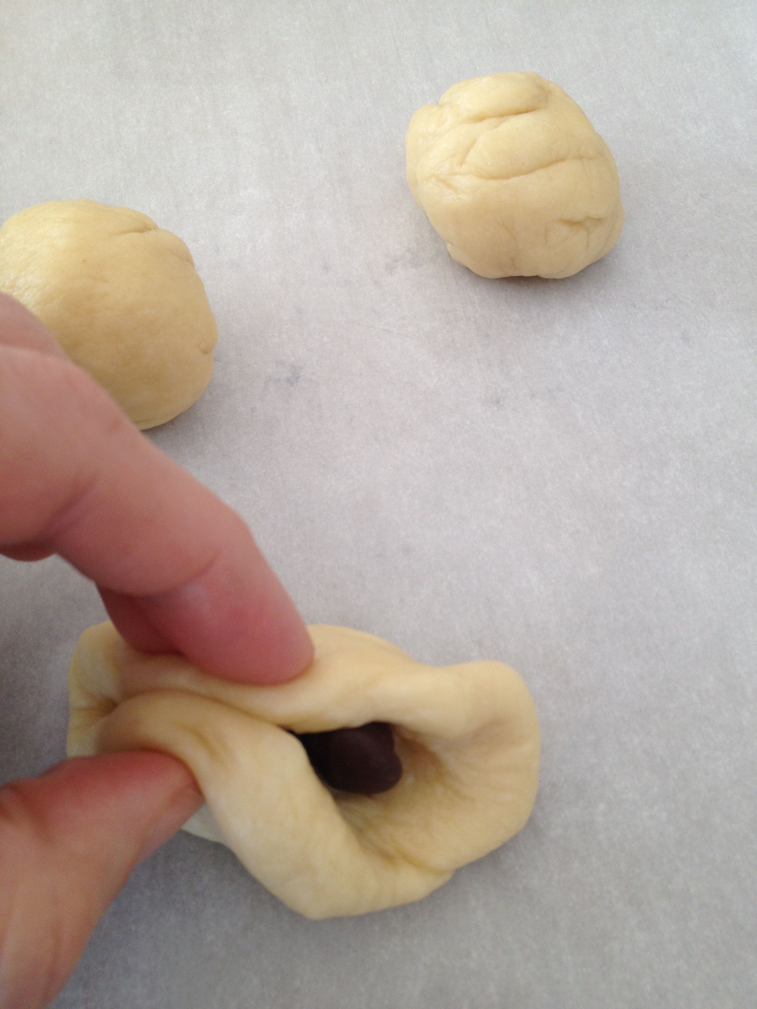 At the Thomas Jefferson School Science Fair earlier this week, students had the opportunity to make their own “Gak” – or polymer made from Elmer’s glue and Borax. It’s fun to play with for a while, until it ends up stuck to the car floor or buried at the bottom of a backpack. At least with homemade bread dough and these magic chocolate buns, you get to play with your dough and eat it, too. For a fun activity and tasty snack all in one, kids can help form the dough balls and stuff them with chocolate chips. (Easy enough for a 7-year-old – see below.) Or for a special breakfast or brunch item, you could make the dough and form the buns the night before; in the morning, just bake for 20 minutes and serve hot and oozy.