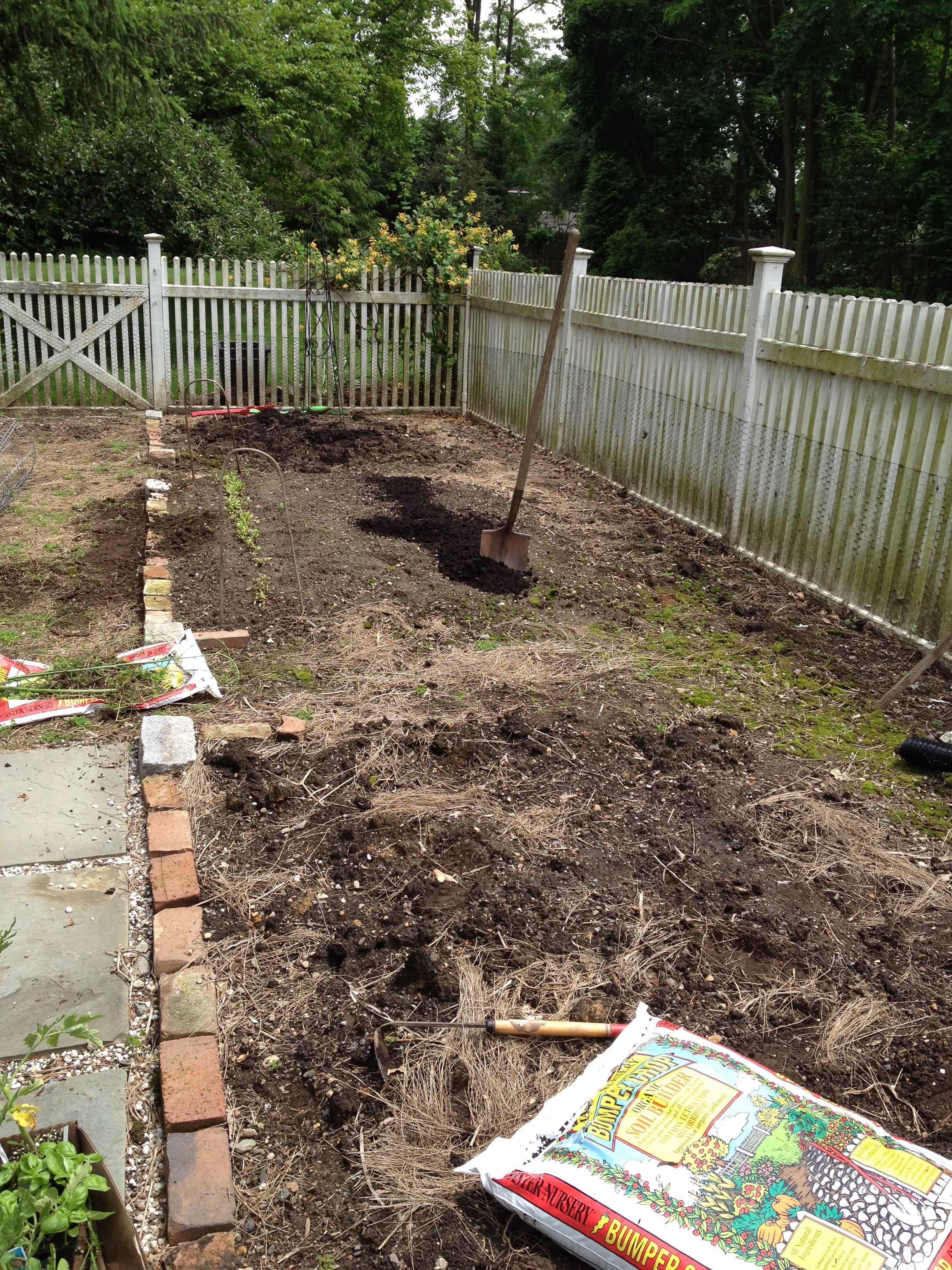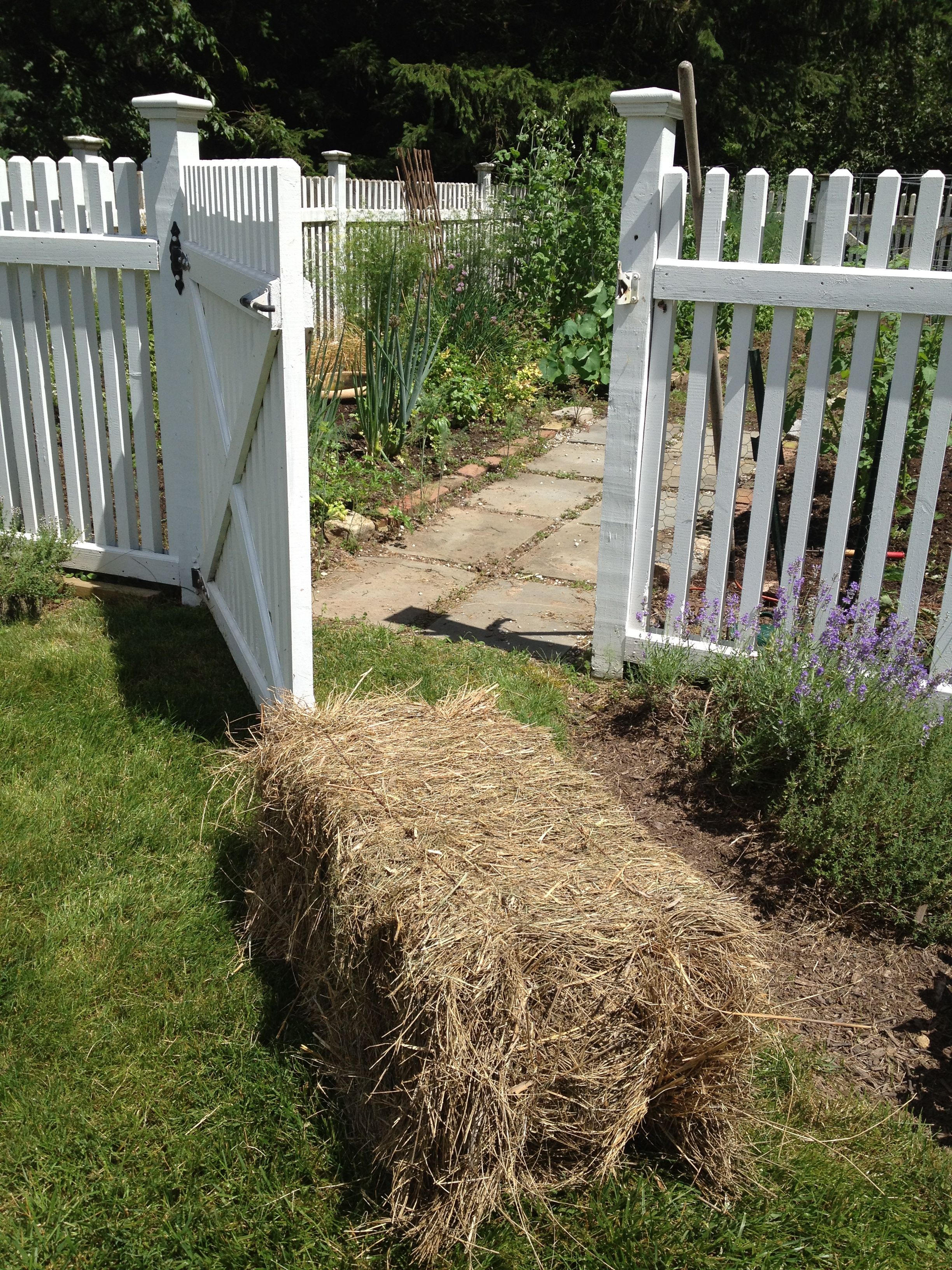 Mid-June: More weeding, and spreading a bale of salt hay (which is not supposed to have seeds) throughout the garden to keep down weeds. It’s starting to look like a vegetable garden!