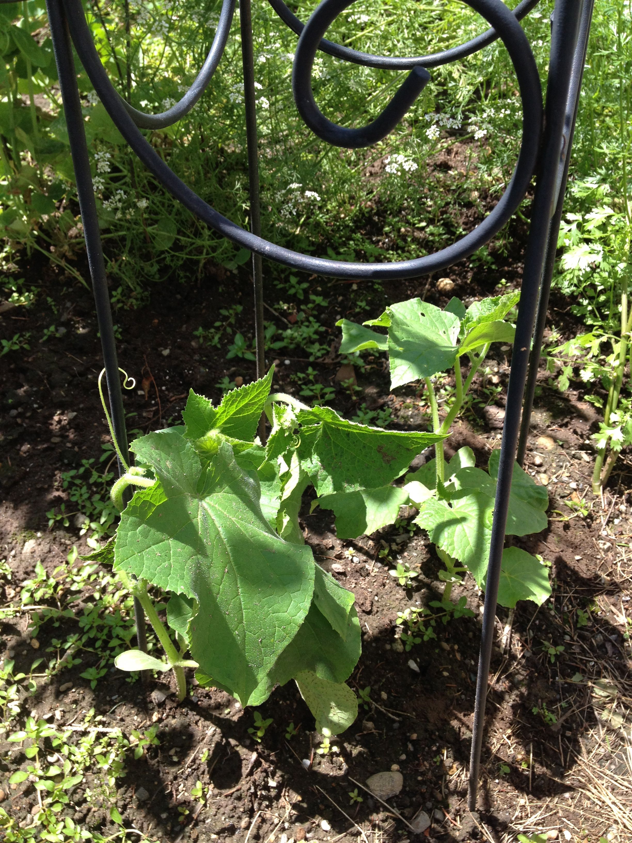 Teeny tiny zucchini! The watch begins for signs of squash vine borer invasion (wilted leaves, sawdust-like mounds on stalks).