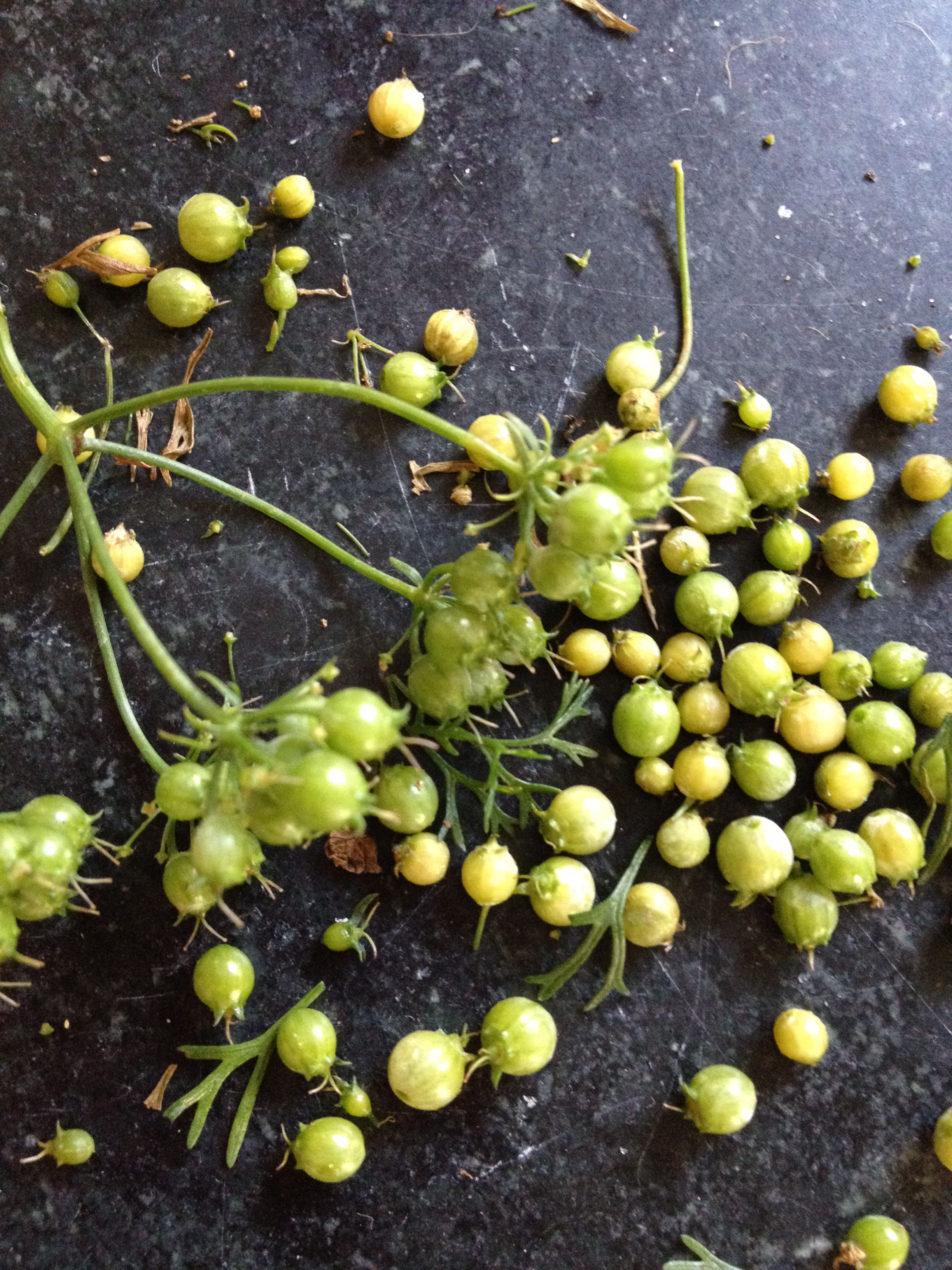 Last Sunday Night: Pulled up some dead cilantro (coriander) plants and gave them a good shake to distribute the seeds for next spring. Picked some green coriander seeds (below) for a chicken marinade. (Very exotic-tasting! We decided to call them Mo-rockin’ Chicken Tacos; recipe to follow shortly.)