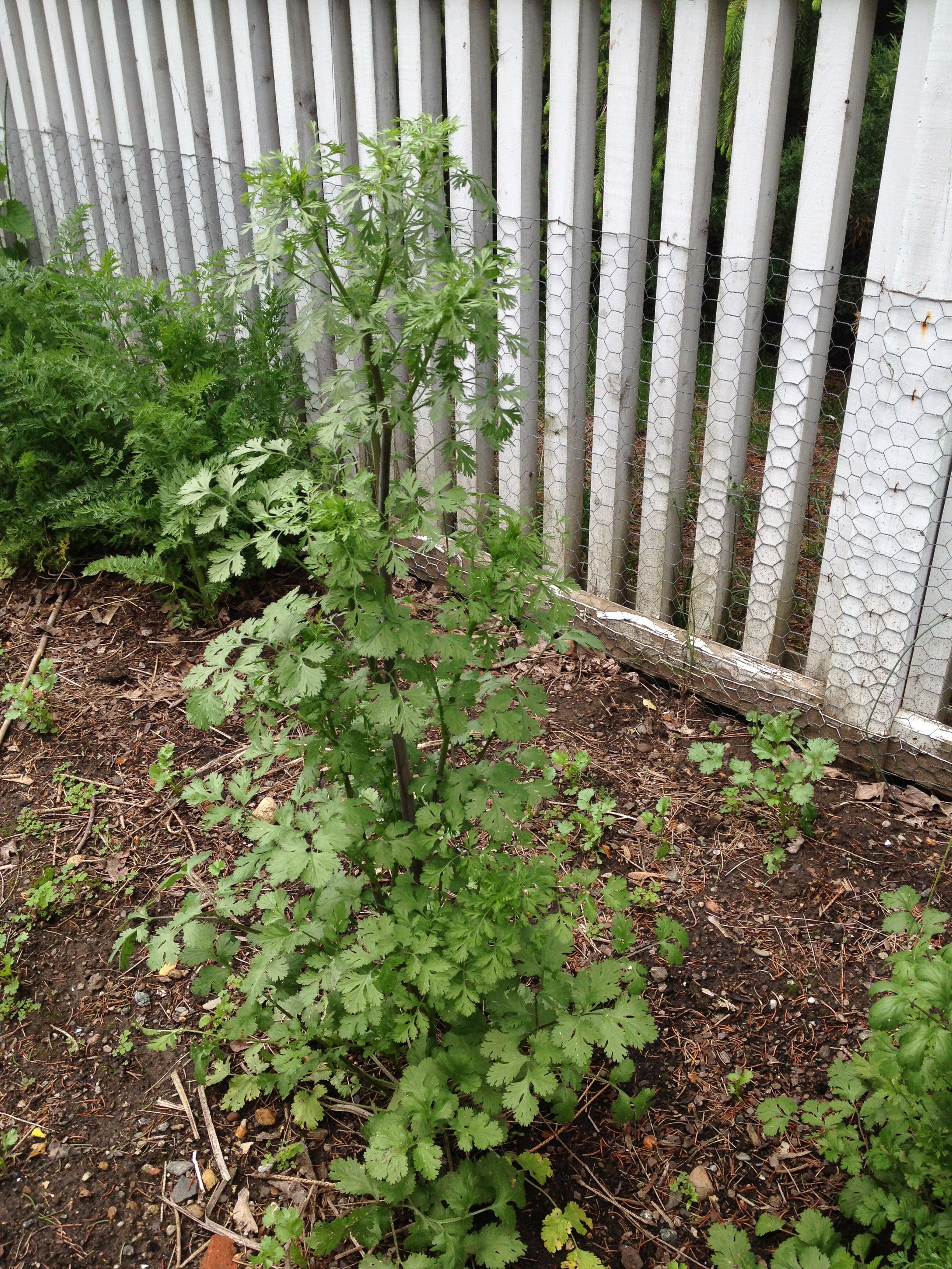Late April:  Finally cleaned up the leaves and removed last year’s remaining carrots (radioactive-huge, like those from Gilligan’s Island) and dead tomato plants. Should’ve dumped some compost or soil builder on the beds at this time but didn’t feel like making a trip to the nursery. Planted a few rows of beets and a row of arugula using seeds left over from last year.  Was not very concerned about spacing the seeds – you can always thin the plants later.  Didn’t feel like setting up a trellis for the tall-growing pole peas (‘Telephone’, also left over), so experimented this year by planting them around the base of large tomato cages. Marveled at my crop of volunteer (self-seeded) cilantro; this is when it pays to be lazy. Each year I harvest the cilantro leaves until the plants bolt (flower); then I let the plants go to seed so that I’ll have another (free) crop next spring. As extra bonuses, the cilantro plants perfume the air on warm nights, and the green seeds (coriander) can be harvested and used in sauces and marinades.