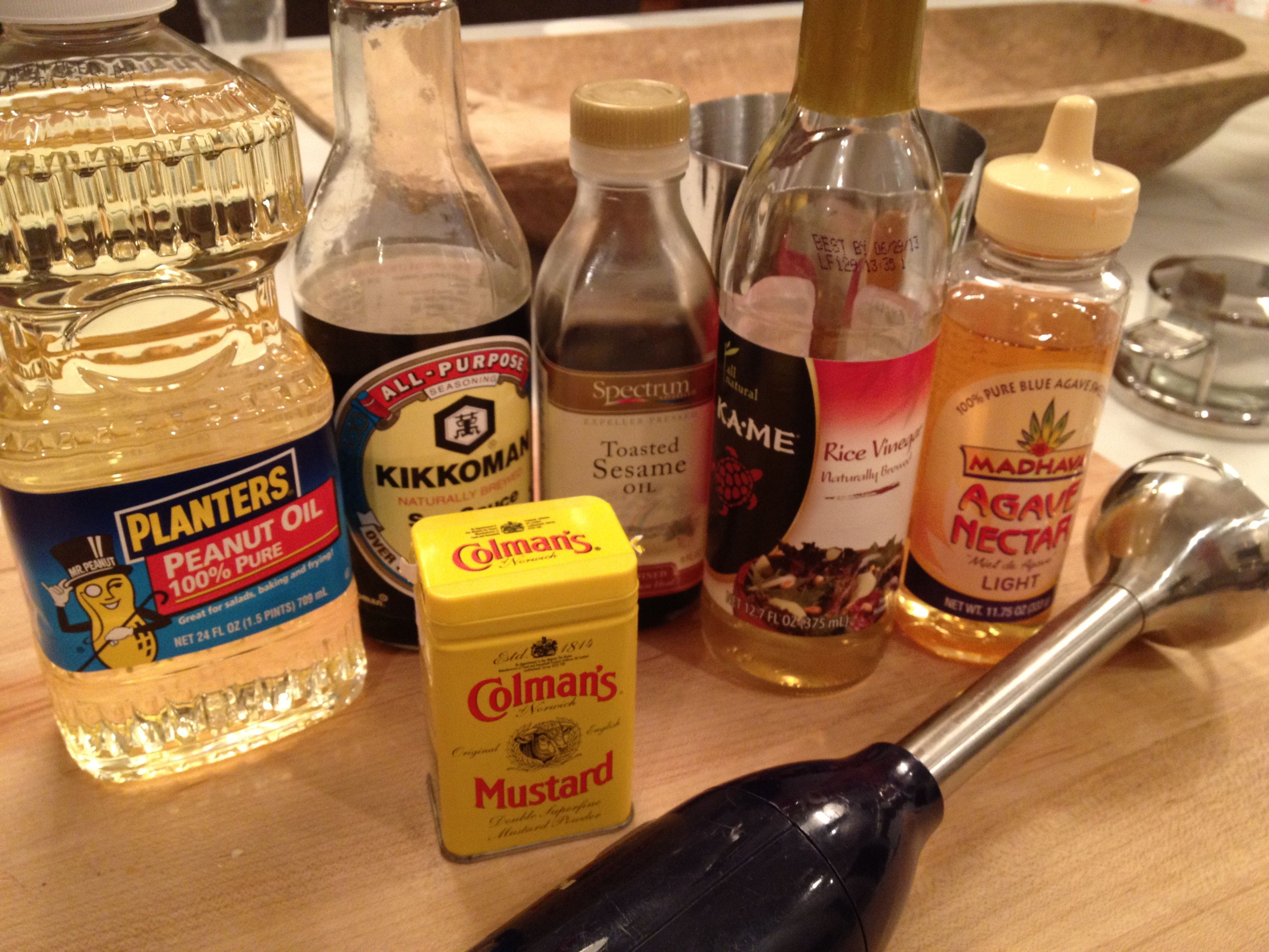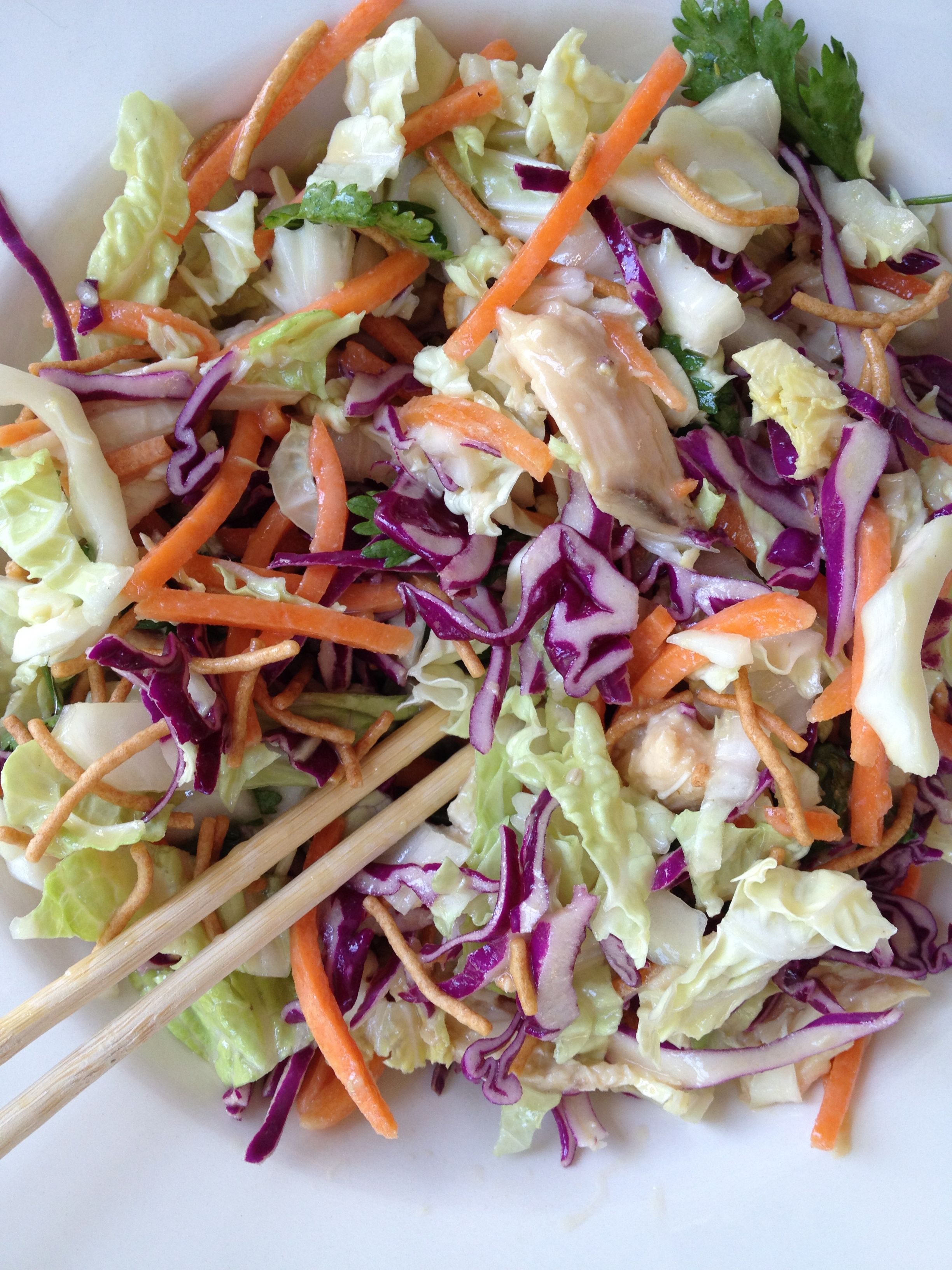 This recipe is a variation of Wolfgang Puck’s Chinois Chicken Salad – which now you can find at airports and food courts across the country but I first experienced years ago at his Santa Monica hot spot, Chinois on Main. (Jennifer and Brad were leaving just as we arrived!) I’ve modified the dressing (which has an almost wasabi-like kick from the Coleman’s mustard) and will often use packaged cole slaw mix and julienned carrots instead of or in addition to chopped napa cabbage.  Feel free to add any vegetables you like and/or have on hand: thinly sliced red bell pepper, julienned snow peas, cucumbers, whole snap peas, etc. For fancier occasions, you could make your own won ton strips (see how-to here at the end of Thai Crunch Salad) instead of using the thin rice noodles (which are actually made from wheat and rice flours).