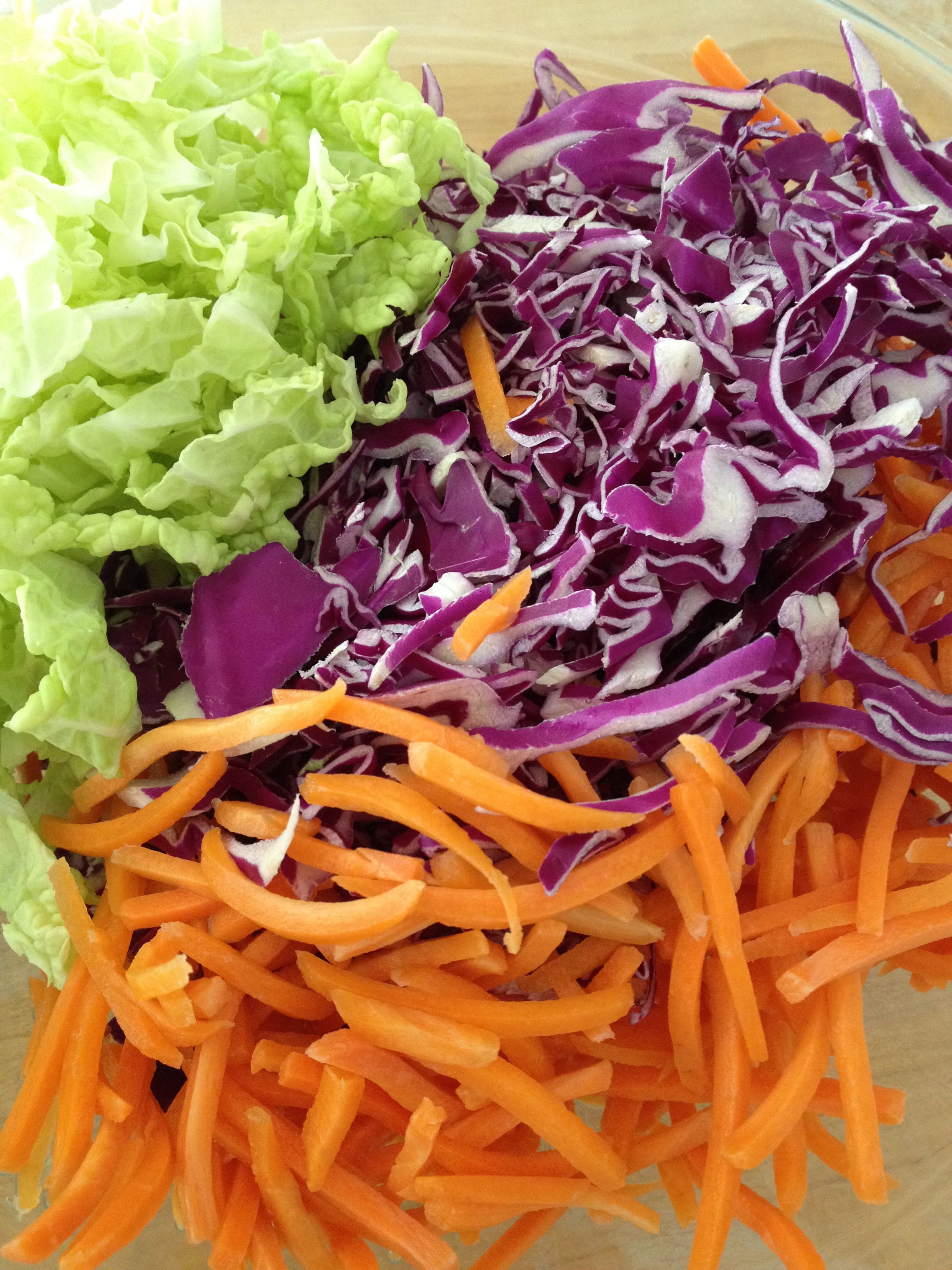• 6 cups of any of the following: shredded Napa cabbage, shredded red cabbage, romaine or packaged coleslaw mix