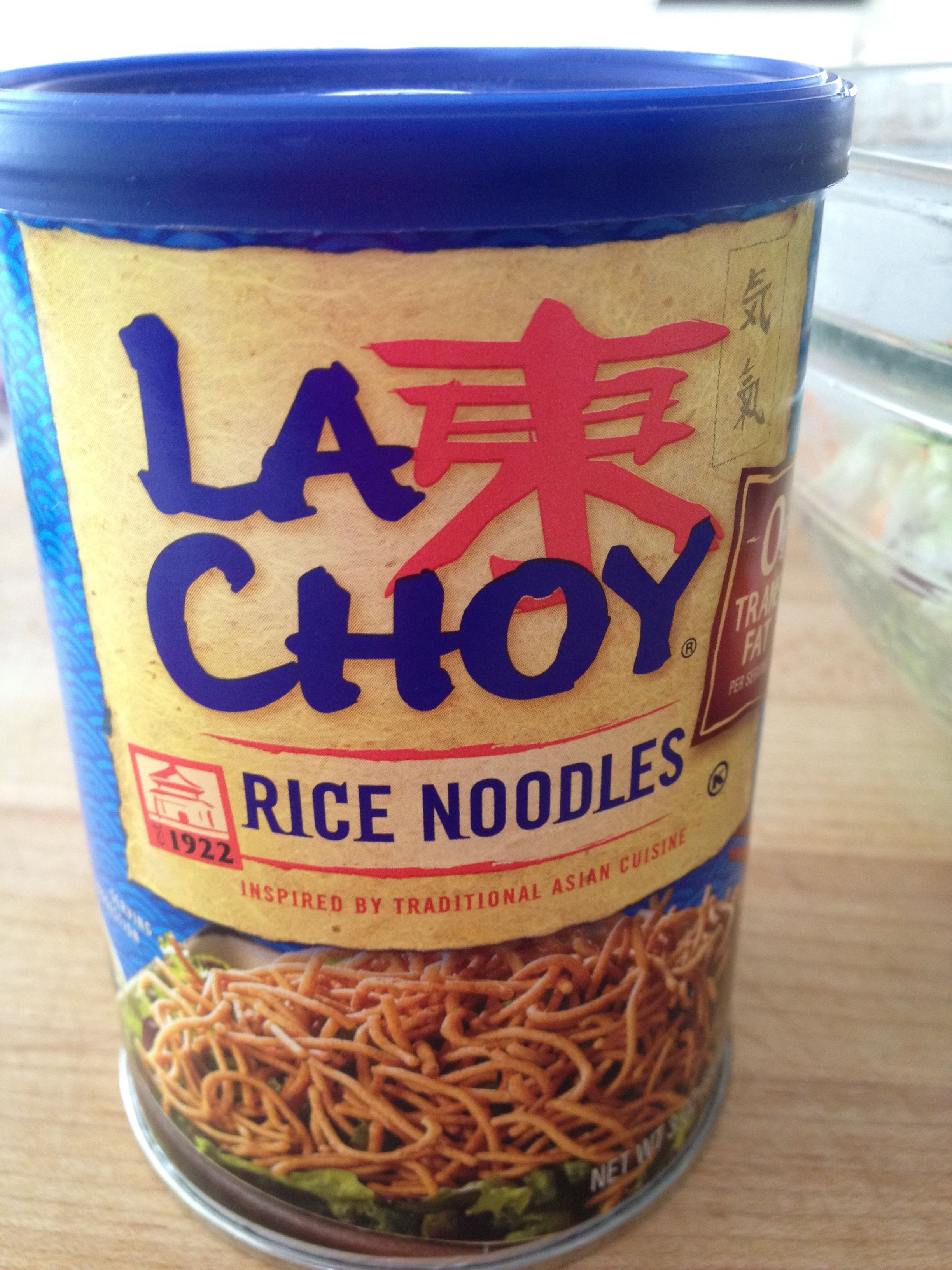 Thanks to my friend Kris F. for telling me about rice noodles! Basically the same as chow mein noodles but thinner and more delicate (and harder to find in stores).
