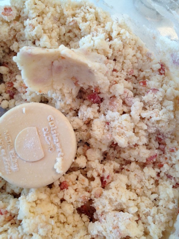 Add the crumbled bacon, flour and salt to a food processor; pulse a few times to combine.