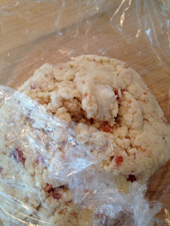 Dump crust mixture onto a large piece of plastic wrap. Gather up the sides of the plastic wrap to help form the dough into a disk. (This just helps contain the mess.) Refrigerate dough for at least an hour, or for up to several days.
