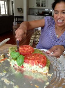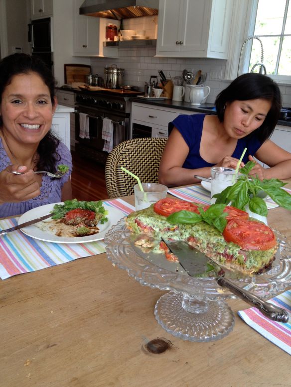With the garden basil going gangbusters and “Jersey Fresh” tomatoes showing up in the markets, the time was ripe for Sara Moulton’s Tomato, Basil and Cheese Tart (WITH BACON CRUST).  In addition to crediting Sara for creating this recipe, I have to acknowledge my mother for discovering it. Whereas I collect cookbooks, she actually uses them.  So thanks, Sara and Karen, for this delicious slice of summer.  And thanks, Patty and Sang, for all you do for our schools! (And for not being mad about these photos. )