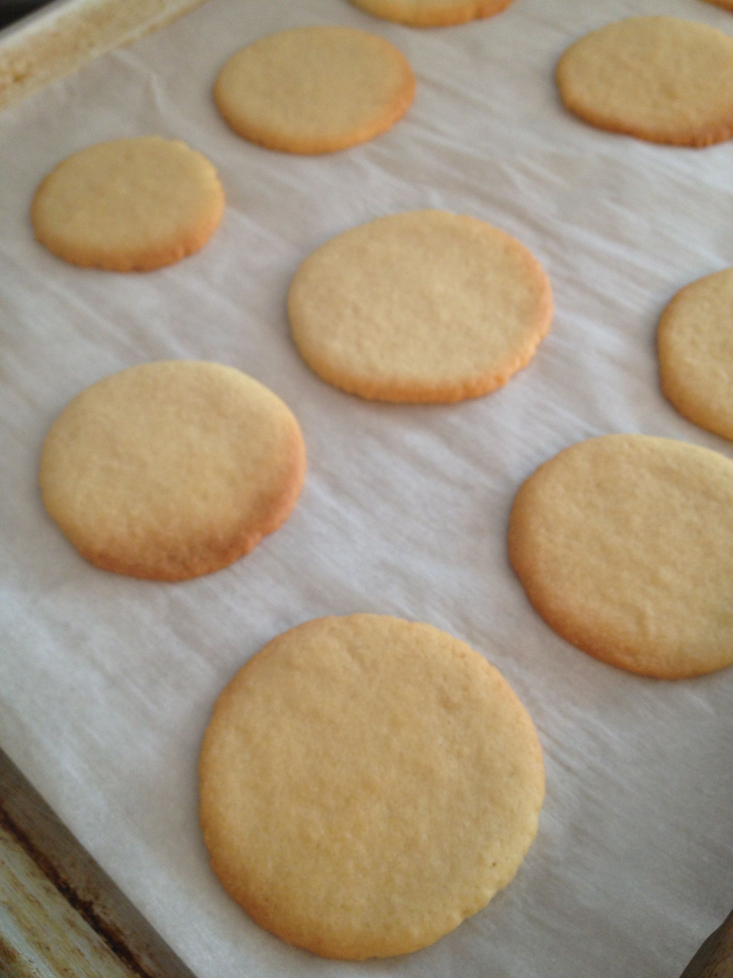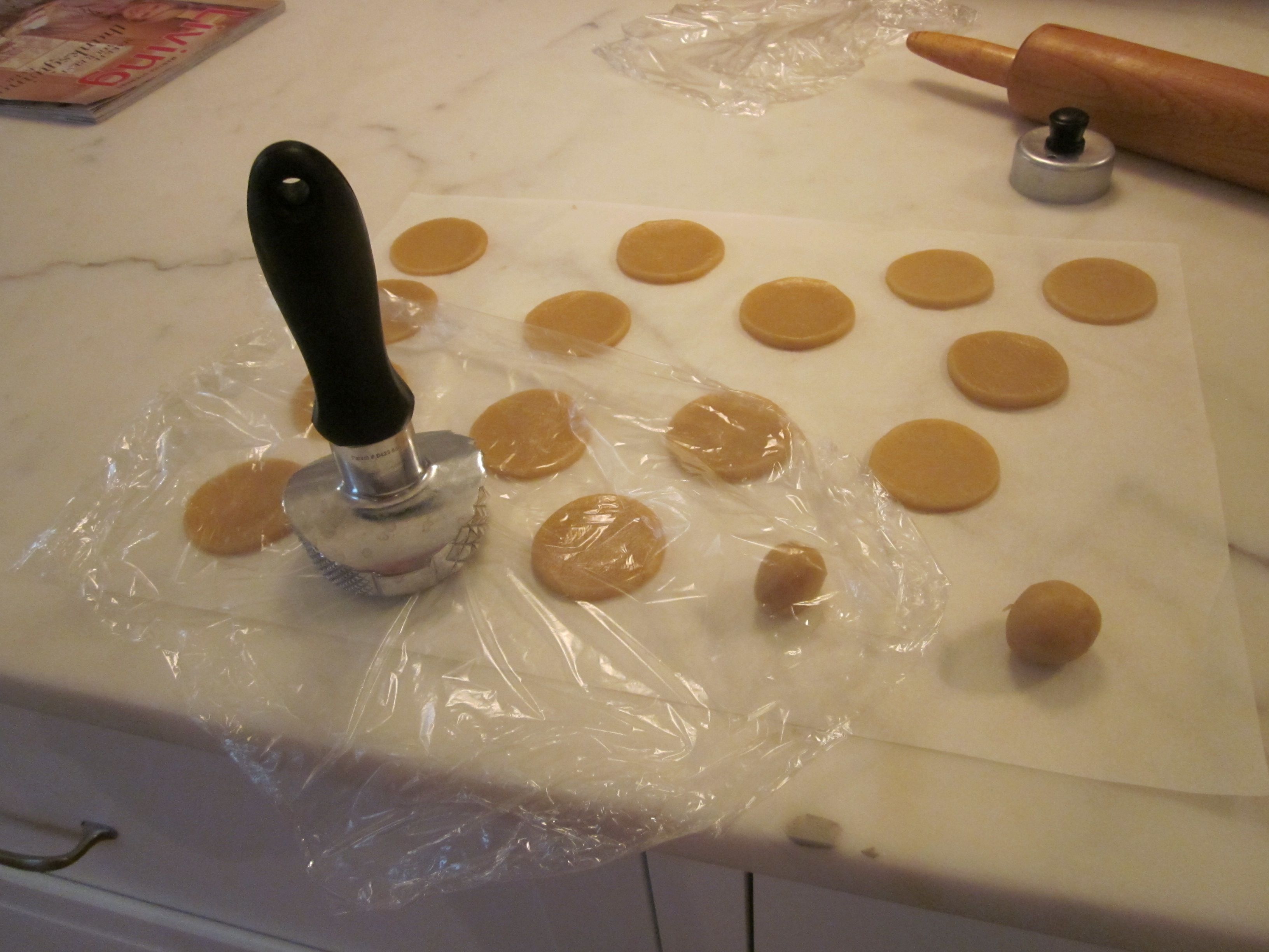 Heat oven to 400ºF. Line 2 baking sheets with parchment paper. On a work surface with parchment paper below and plastic wrap on top (to prevent rolling pin from sticking), roll out dough to about 1/8” (3mm) thickness. Use a small (approx. 2” diameter) biscuit cutter to cut out as many circles as possible. Place circles onto baking sheets, approximately 2 inches apart. Repeat with remaining dough – returning dough to freezer if necessary to help maintain crisp circle shapes.