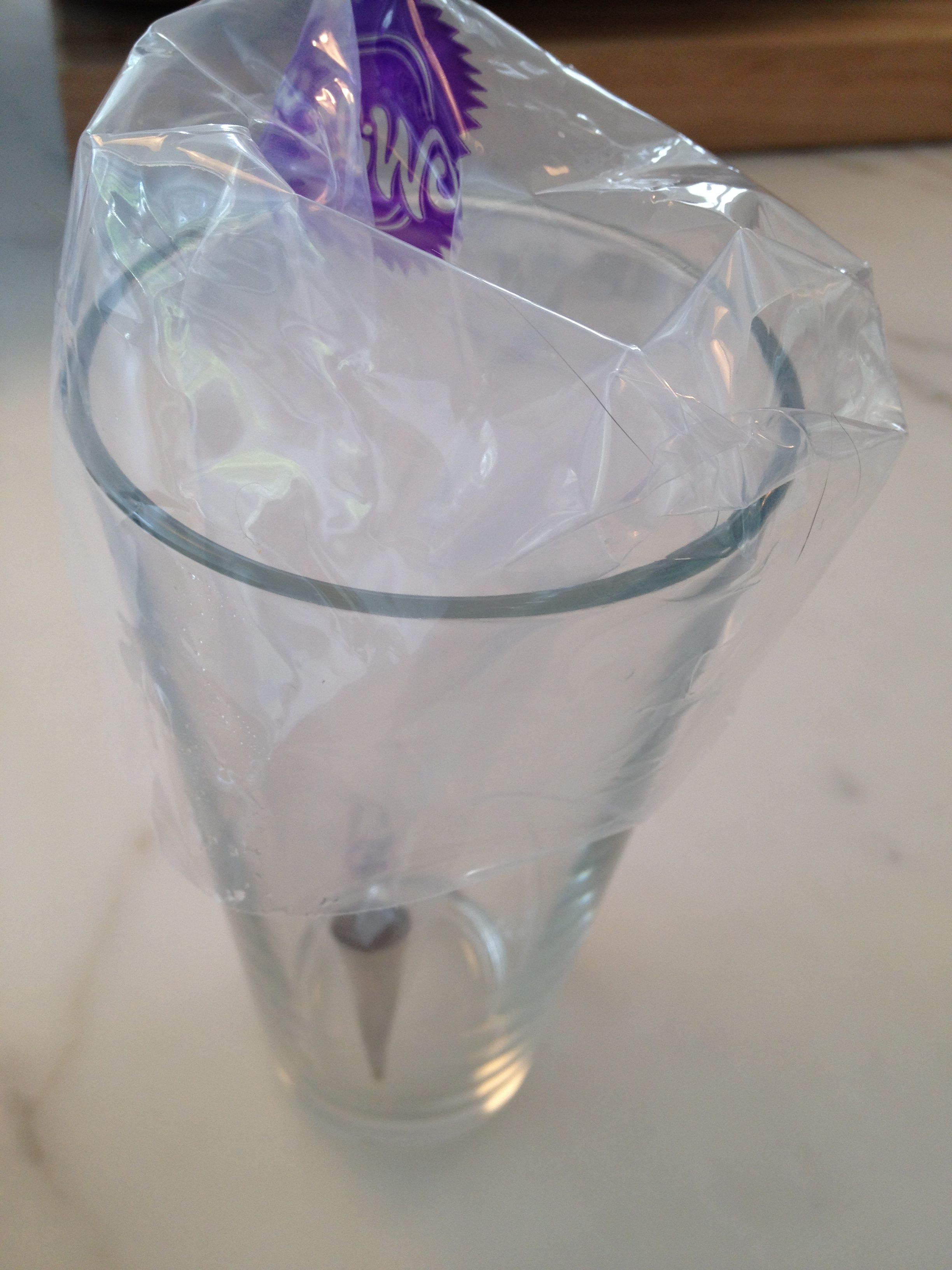 Fit a small round decorating tip inside a disposable pastry bag. Fold the top of the bag inside out to make a cuff, and set in a tall glass.