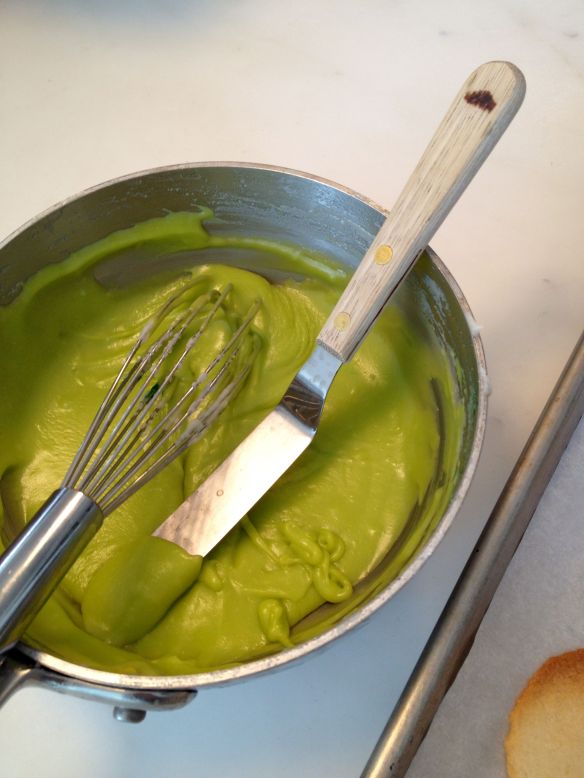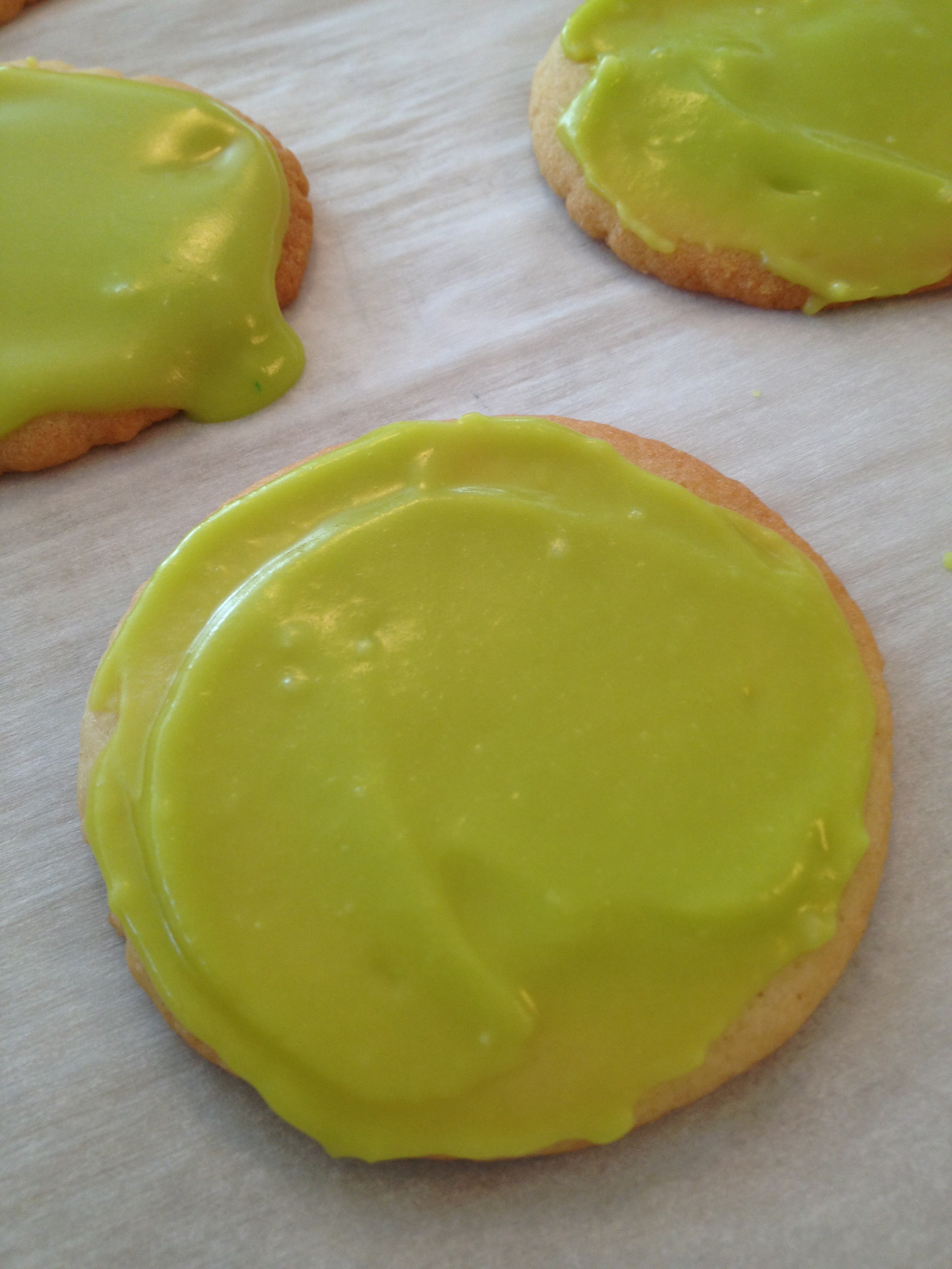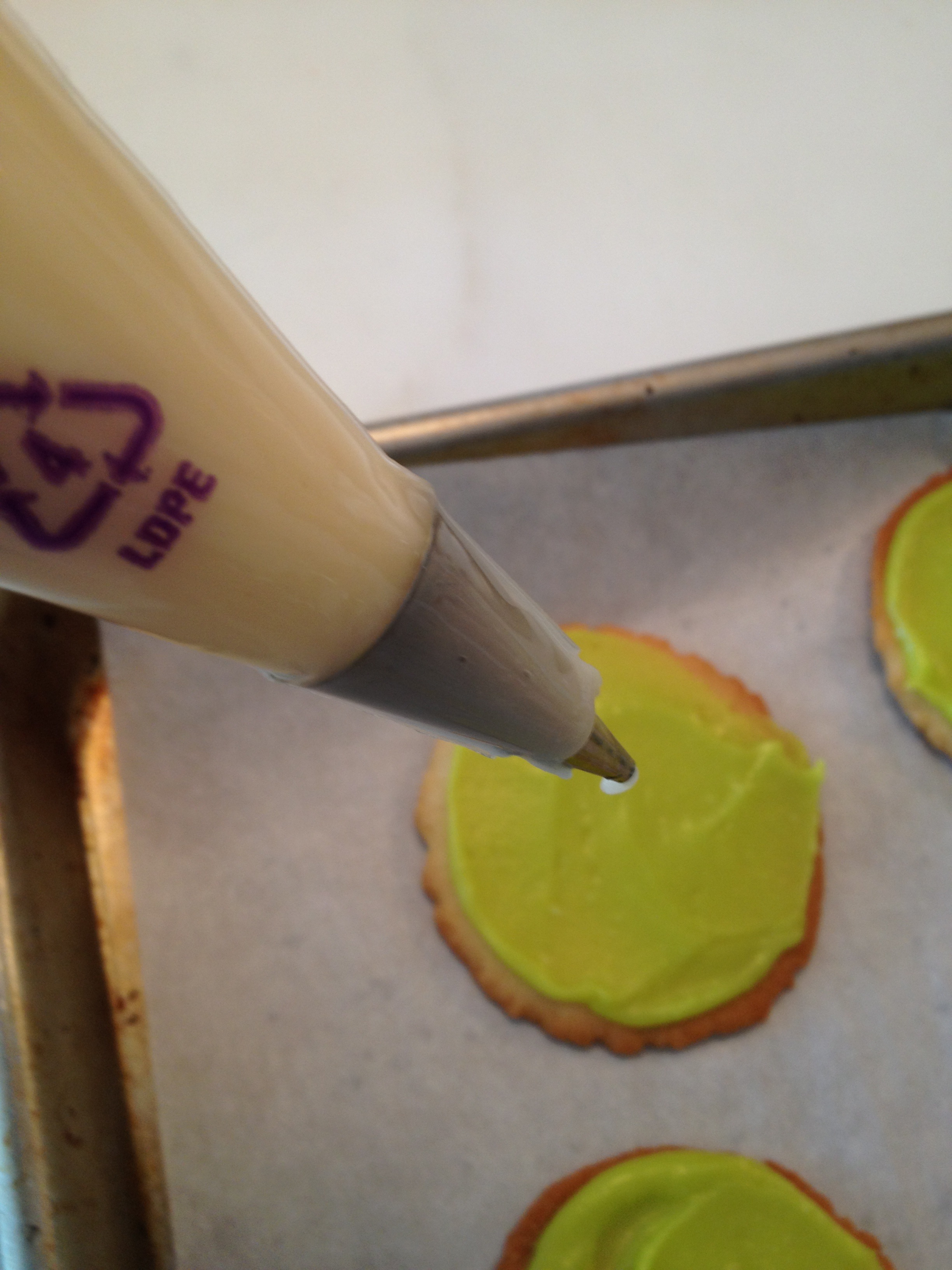When all cookies are glazed yellow-green, add white lines by piping two curved lines with the pastry bag. (If you didn’t sift the powdered sugar, you might end up with lumps that clog the pastry tip; this is more annoying that the slight inconvenience of sifting sugar.)