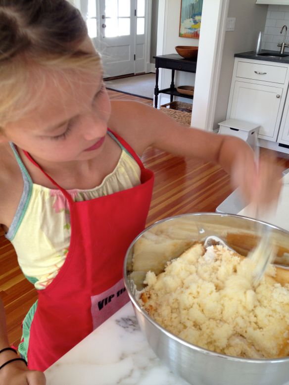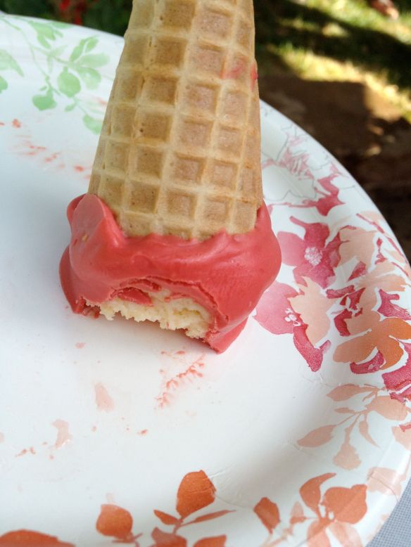 Cut about an inch off the tops of the sugar cones with a serrated knife.  Scoring all around first and then carefully sawing through made for a cleaner break. (We put the “cone cuttings” in a bag for future snacking and ice cream topping.)
