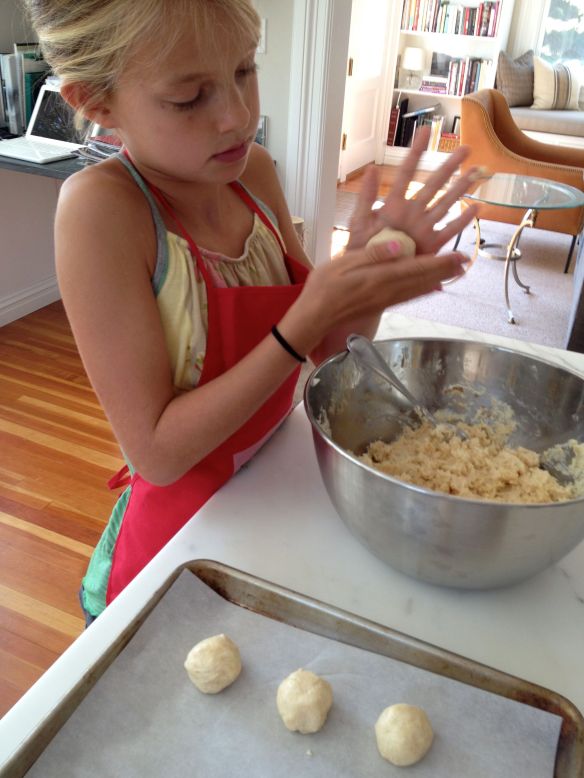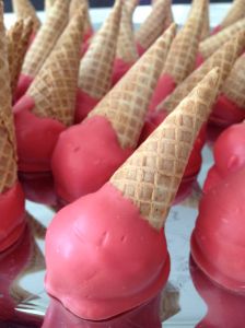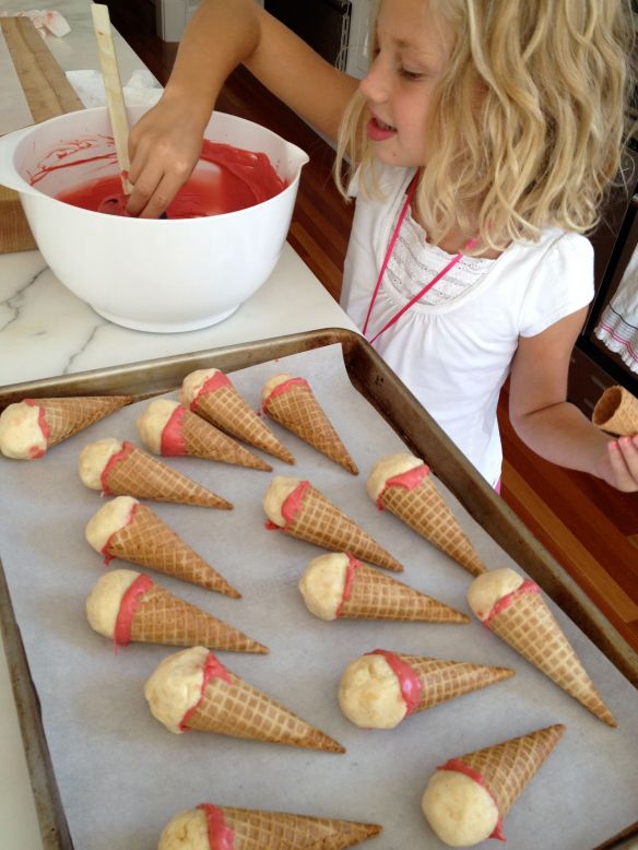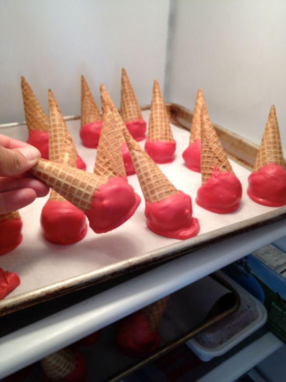 Whether using a lollypop stick for traditional cake pops or cones in this case, it’s helpful to use some of the melted coating as “glue” to keep the cake balls in place. Sophie helped dip the tops of the cones into the coating and then place a chilled cake ball on top. Repeat with all cones and then refrigerate/freeze again for a few minutes more. (I lined the baking sheets with parchment paper but this isn’t really necessary.)