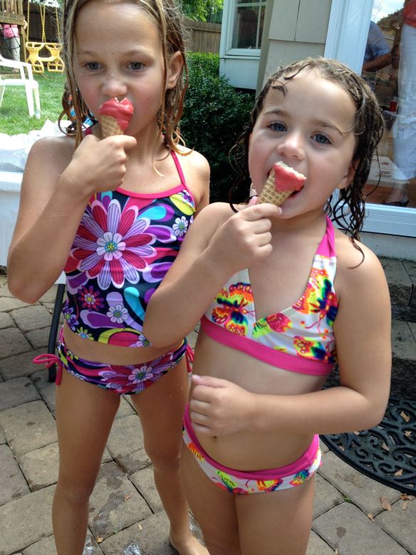 Melt the candy melts in the microwave in 30-second increments, stirring after each zap until smooth. I had wanted to make the coating light pink, but only had a bag of red and a bag of white candy melts on hand (probably left over from a Valentine’s Day project I never got around to).  The result was more “watermelon” than pink, but the kids didn’t seem to mind.