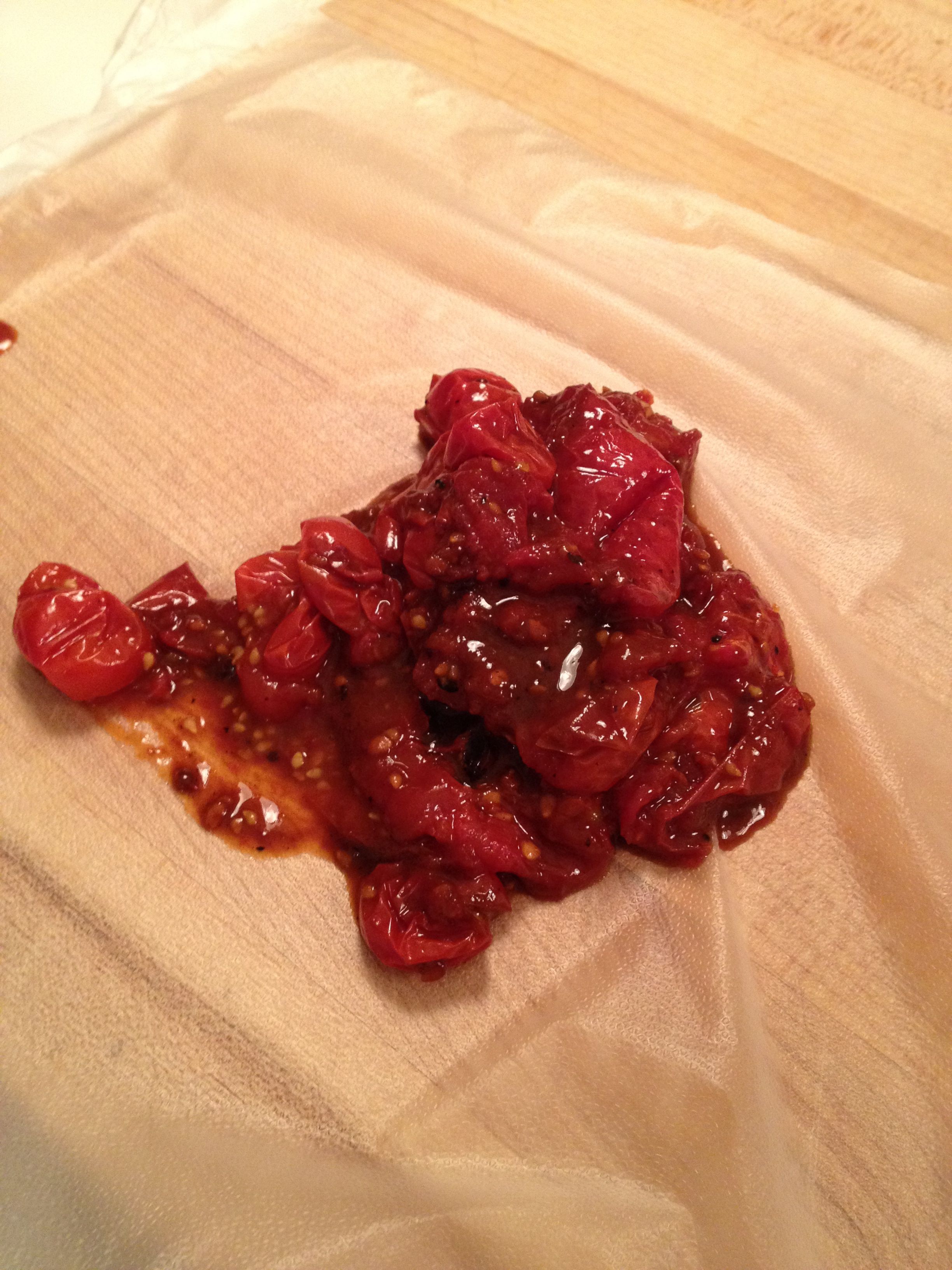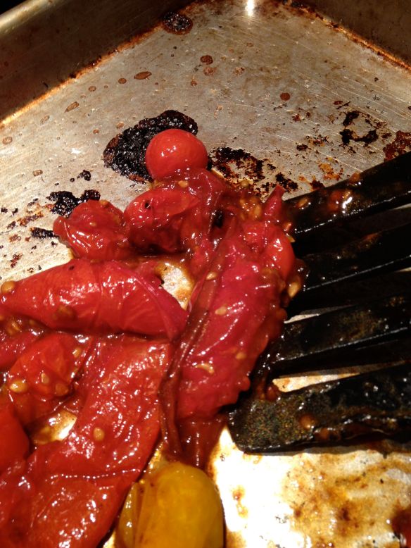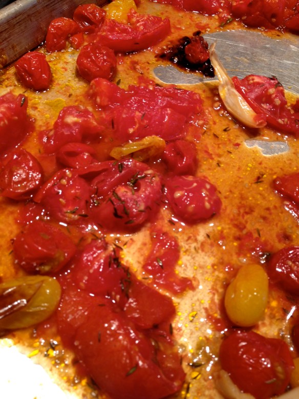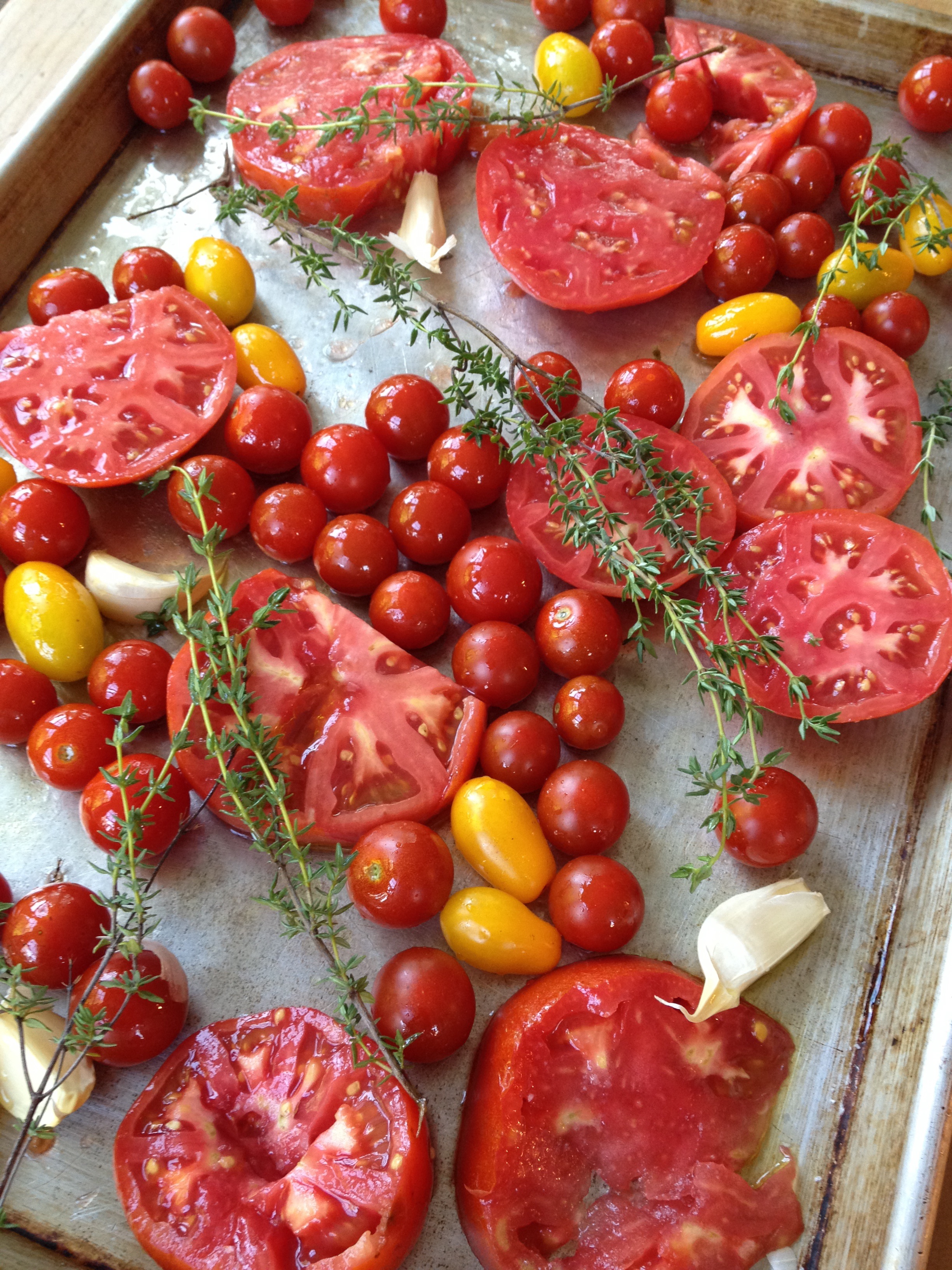 Cooked at high heat with a little olive oil, salt and flavorings such as garlic cloves or fresh thyme sprigs, the tomatoes ooze and burst and caramelize right on the baking sheet. Scrape up the tomatoes and all the browned bits from the pan and voilà – Tomato Caramel.