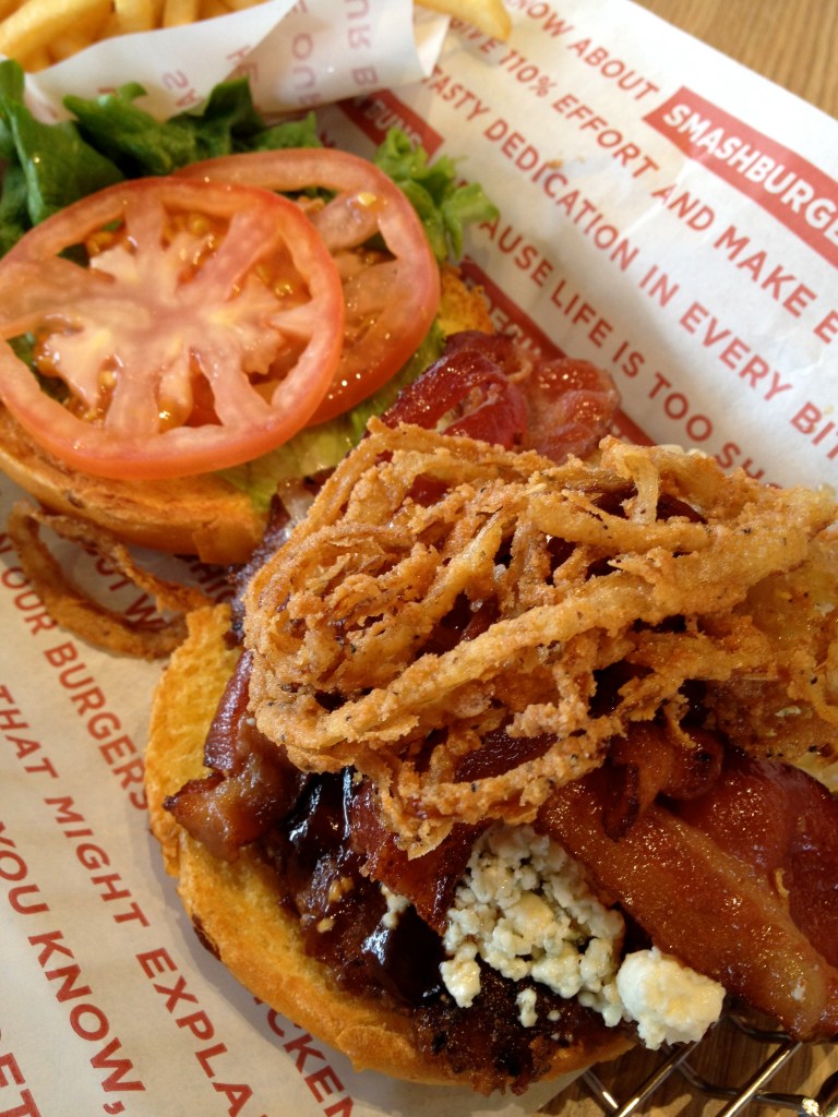 SmashBurger’s “New Jersey” Burger with tomatoes — oh, and bacon, crispy onions and blue cheese (and my personal substitution of BBQ sauce instead of mayo to save a few calories).