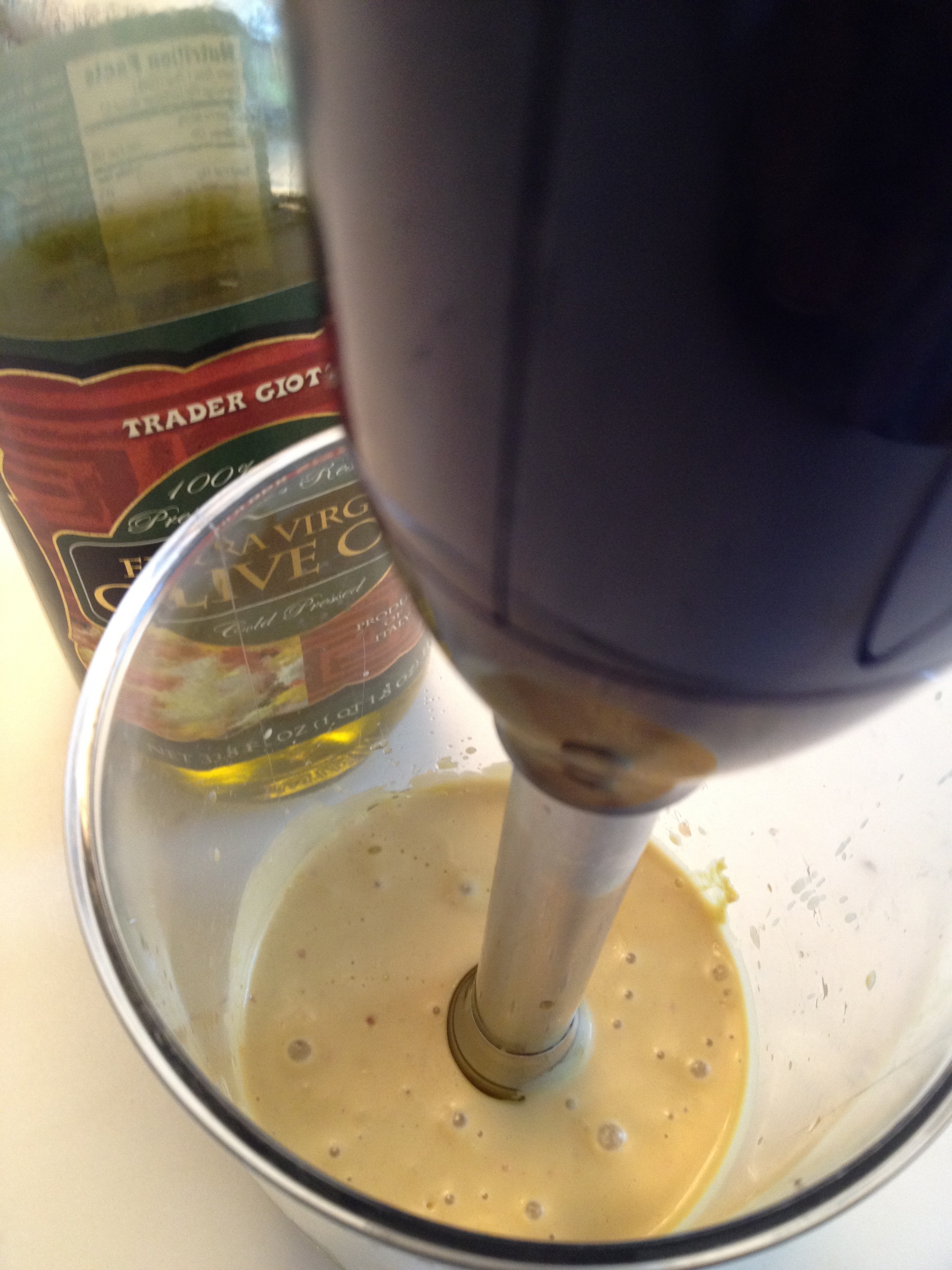 Add everything but the olive oil to a small bowl or immersion blender beaker. Stir or blend to combine. Slowly whisk in or blend the olive oil until all incorporated. Taste for seasoning; add more salt, a pinch of sugar, or a little more olive oil if necessary.