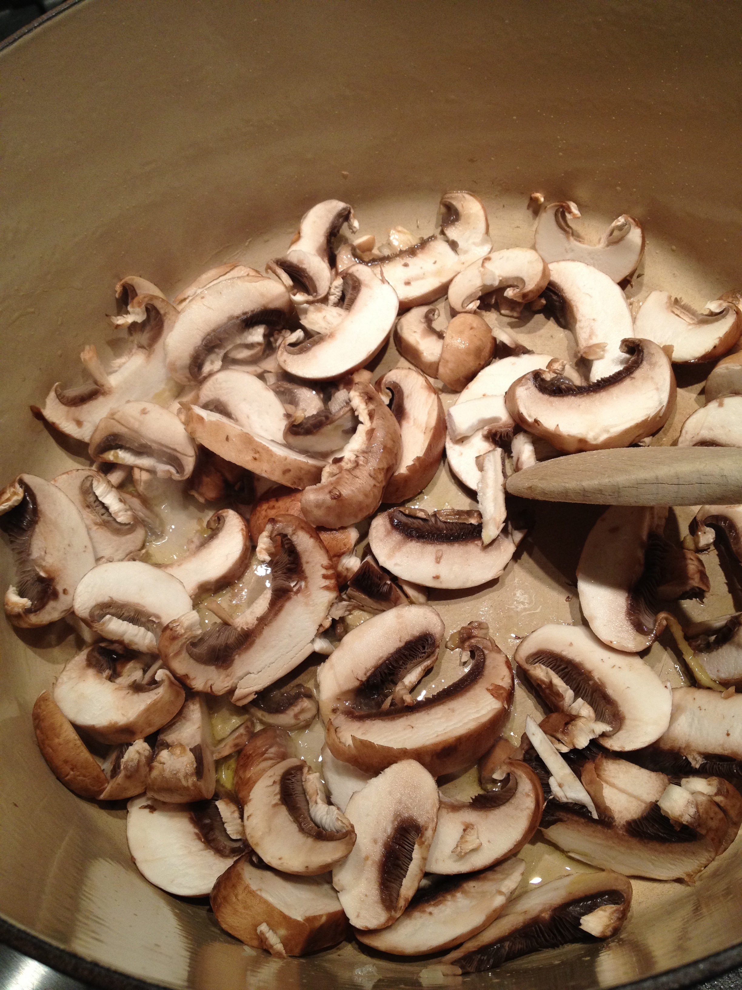 Set out a large pot or Dutch oven (not a nonstick pot, because you want fond, or caramelized bits, to form on the bottom). Heat olive oil over medium-high heat; add mushrooms and ½ teaspoon kosher salt and sauté until browned – about 5 minutes. (The mushrooms will shrink significantly as the water in them is cooked out.)