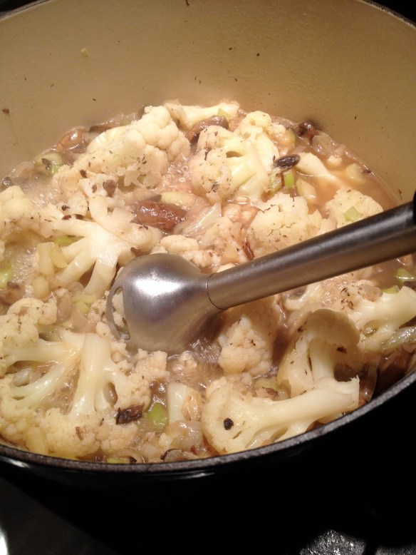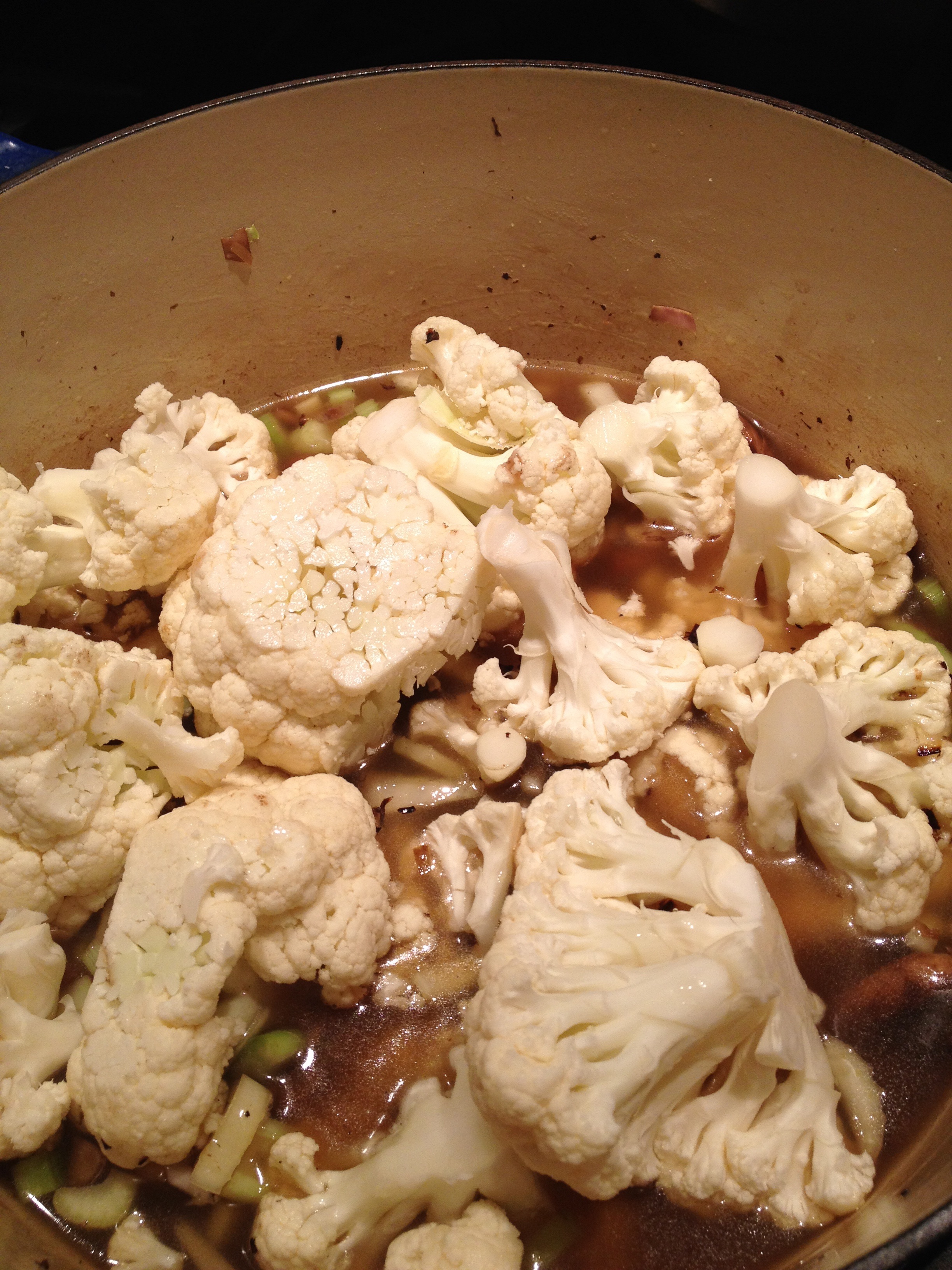 Add chicken stock, cauliflower florets and another ½ teaspoon kosher salt. Cover and steam/simmer until cauliflower is tender (5-7 minutes).