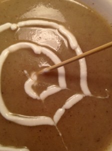 For spider web, place some sour cream in a plastic bag.  Cut off the tip of the bag; starting from the center, make a swirl on top of the soup. Using a bamboo or metal skewer and starting in the center, drag through the soup and swirl to the edge of the soup bowl. Repeat until you have a spider web.