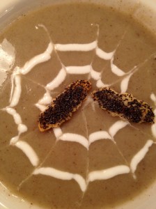 Besides having “zero” calories, this soup 1) tastes rich and complex, 2) is gluten and dairy-free, and 3) contains four types of vegetables but no one will ever know. (We have some vegetable-phobes in our house.) And – like any pureed soup, it can also be dressed up for Halloween with a sour cream spider web.  This will up the calorie count a little, but will keep the attention away from the exact contents of the soup. (I called it Mystery Soup.)
