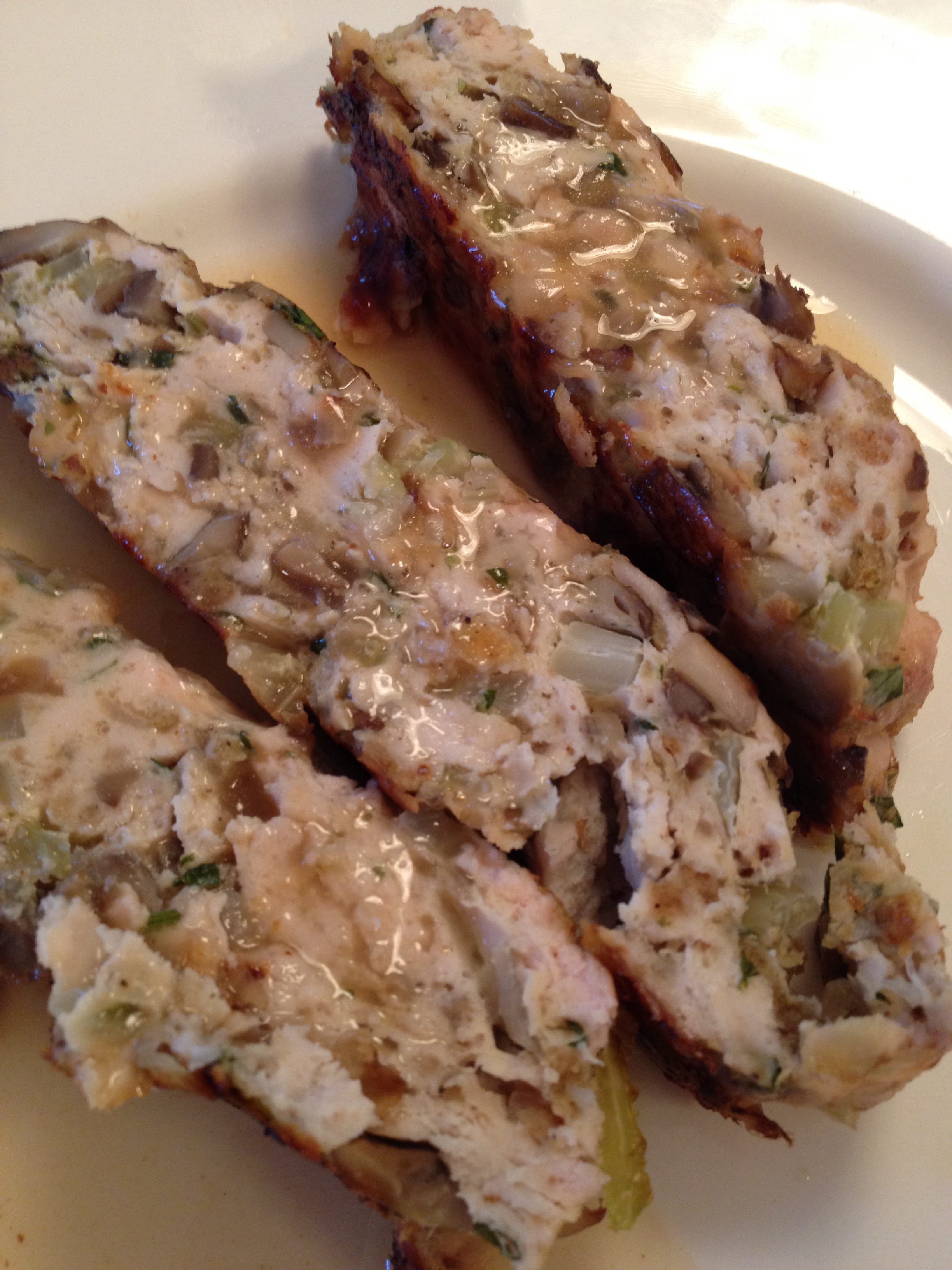 Slice and serve with traditional gravy, cranberry sauce, or as shown here below with an apple cider reduction. (Boil 2 cups apple cider and 2 tablespoons of cider vinegar until reduced by half; swirl in 2 tablespoons of butter until incorporated; on the sweet side, but was a hit with the kids.)