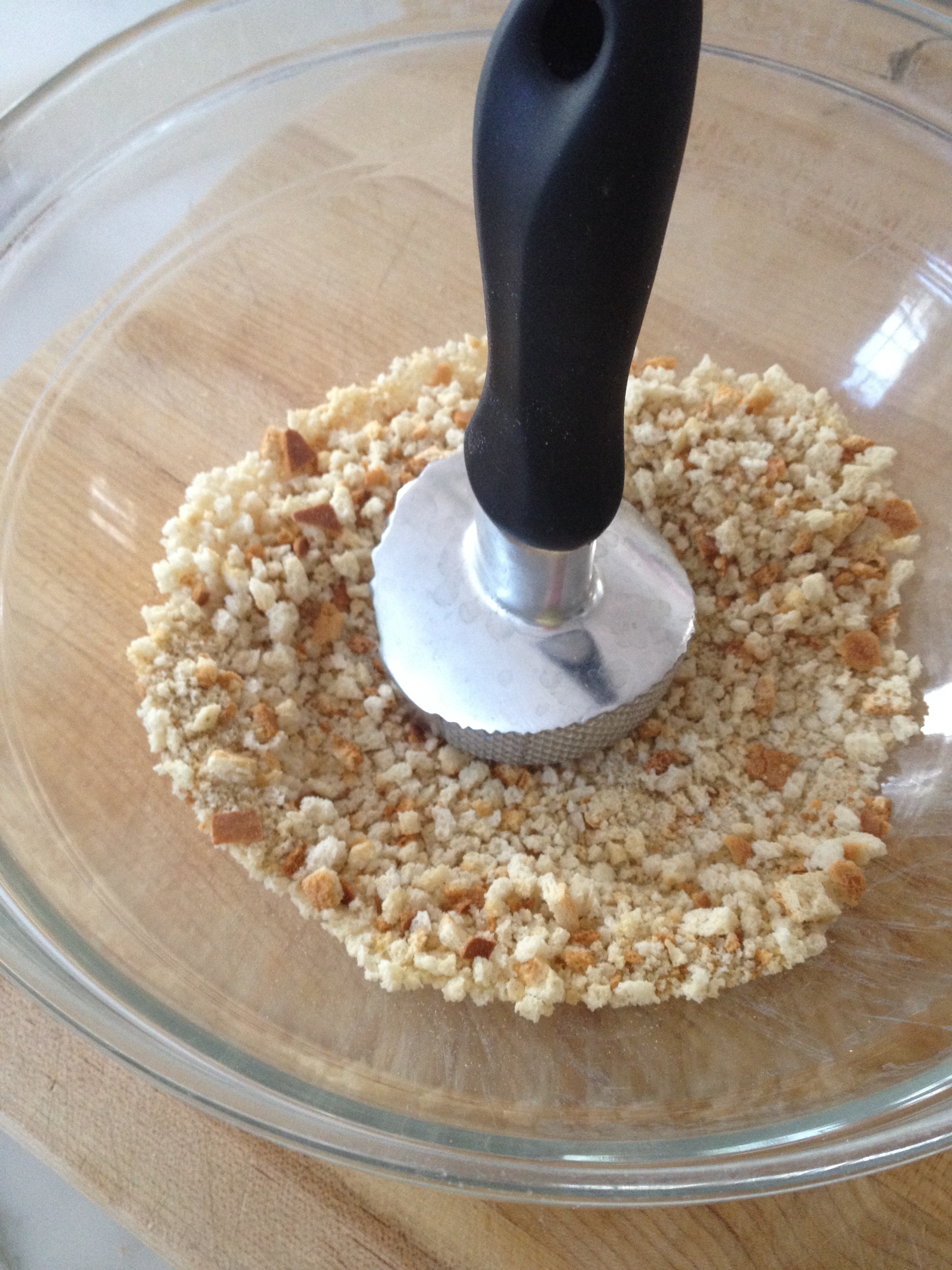 In a large mixing bowl, add seasoned stuffing cubes. Crush into crumbs using a meat tenderizer or bottom of glass.