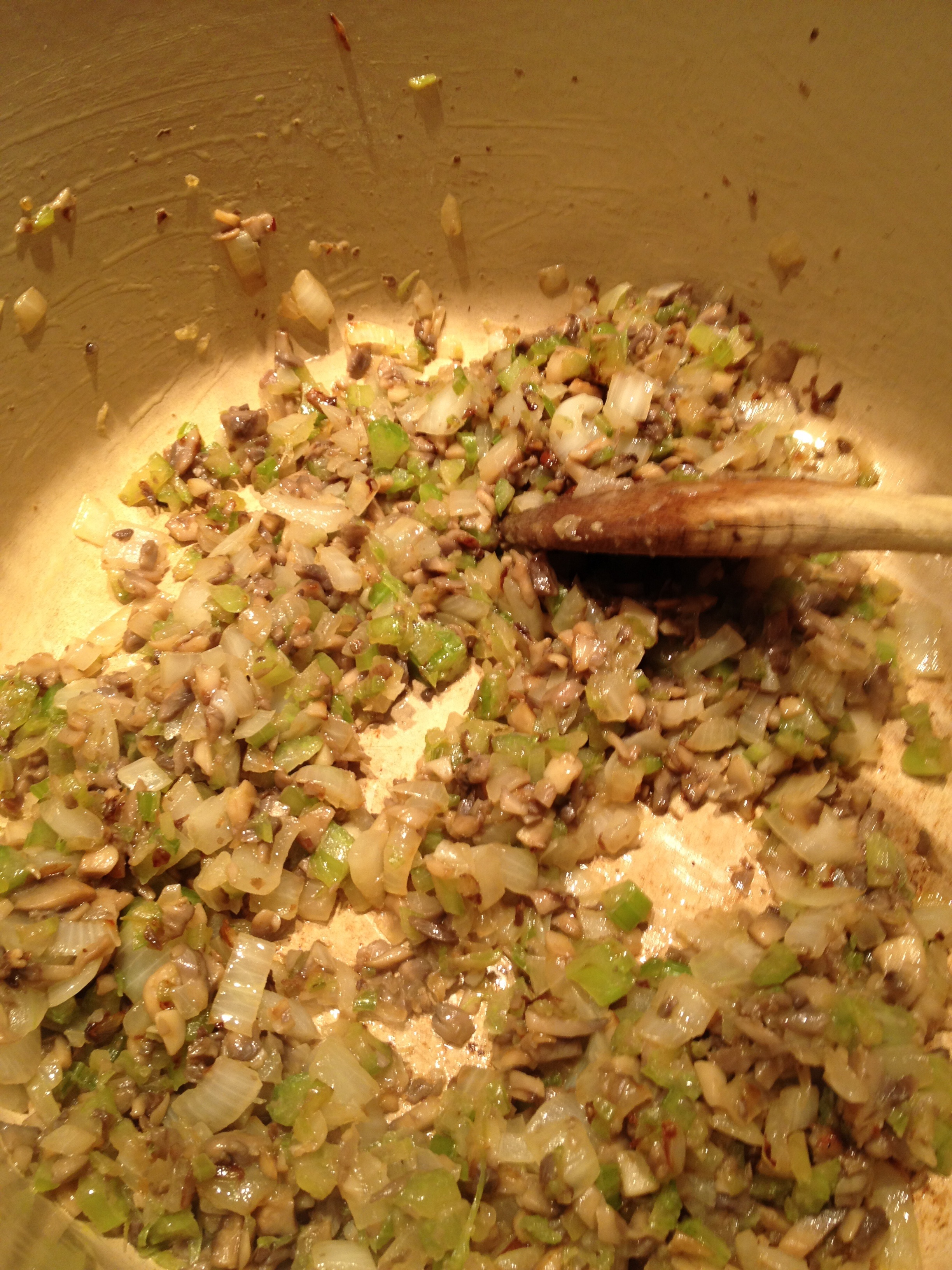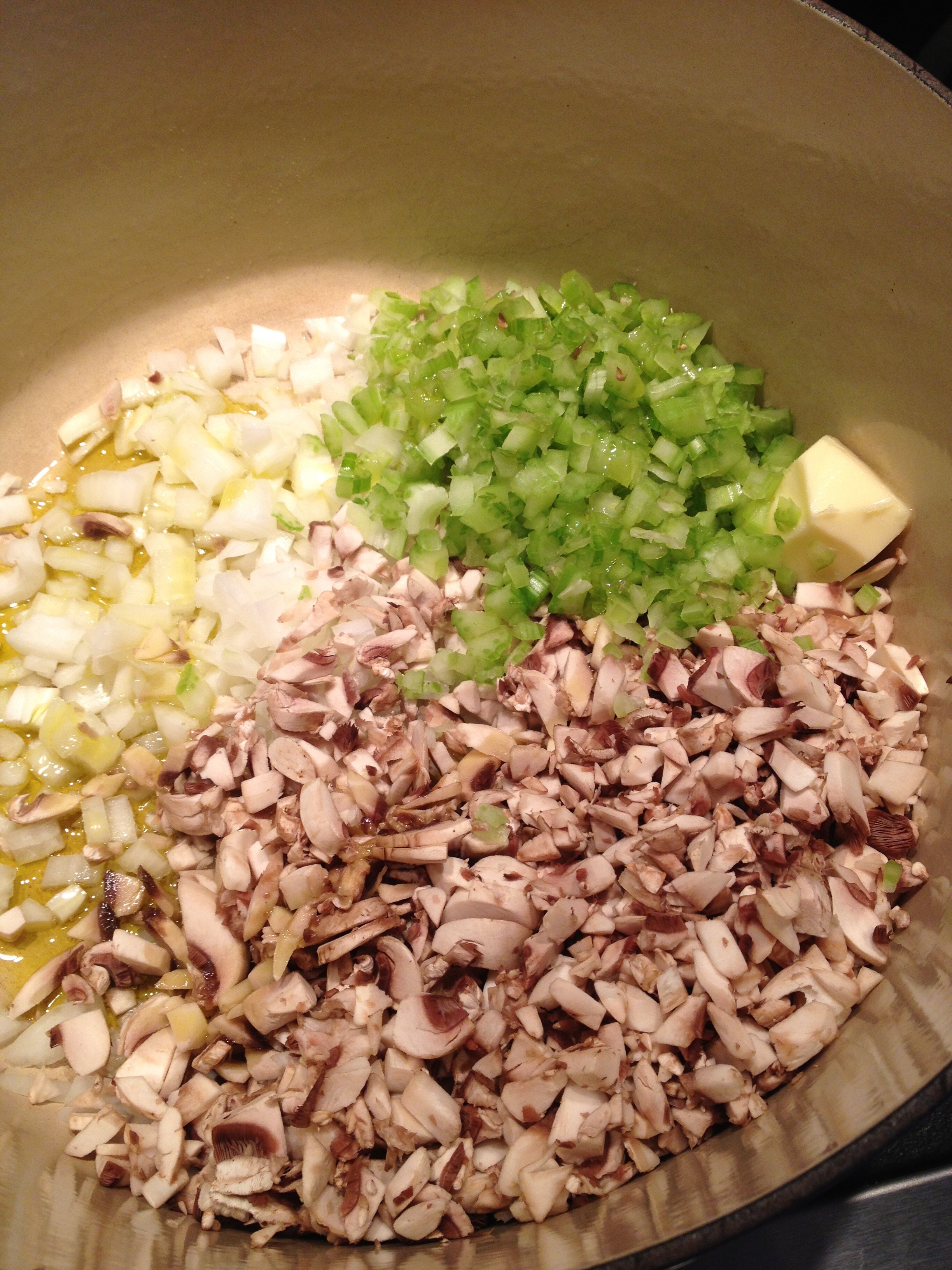 In a large nonstick pan or Dutch oven, heat butter/oil. Add onion, mushrooms and celery and sauté until onions are translucent and mushrooms have started to brown. Remove from heat and allow to cool slightly.