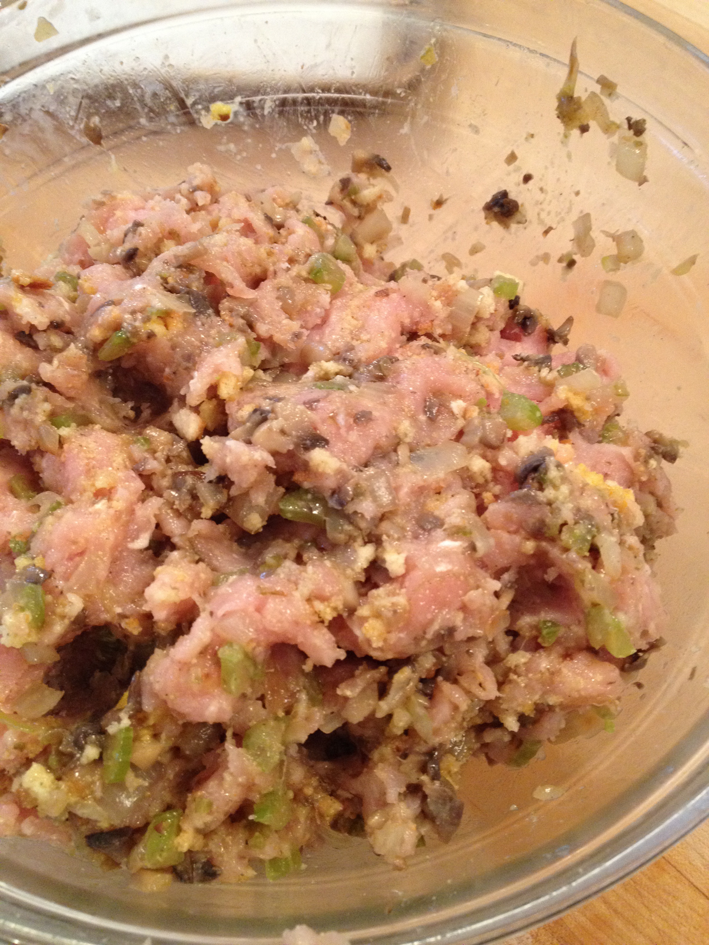 Add turkey, eggs, salt and poultry seasoning or sage. Add sautéd vegetable mixture. Using your hands, gently mix everything together. (You could also use a spoon, but your hands give you better control and prevent the loaf from getting too dense.)