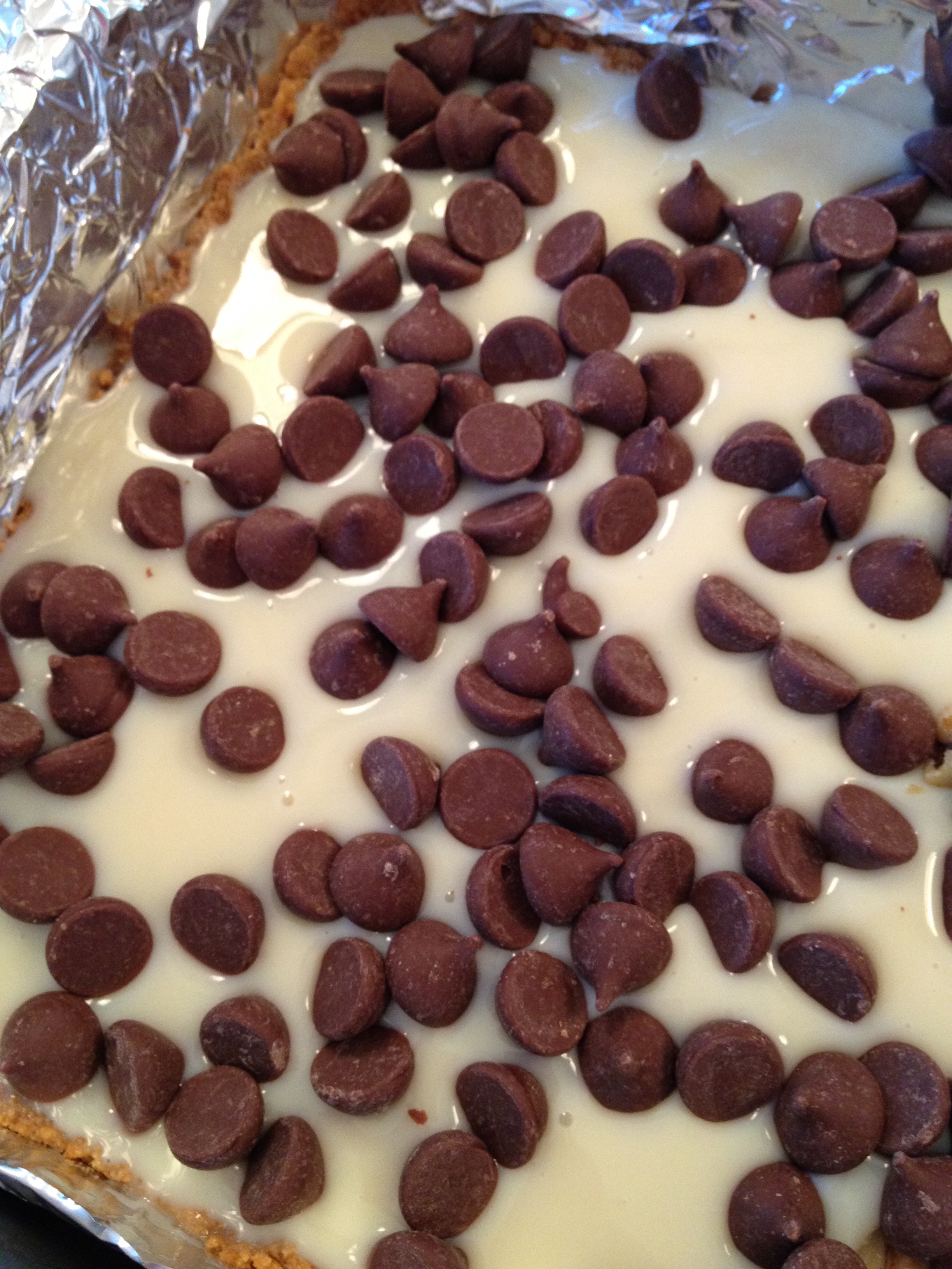 Remove from oven and pour condensed milk over crust; spread into an even layer. Sprinkle with Mini Kisses and then top with mini marshmallows. Press down lightly.