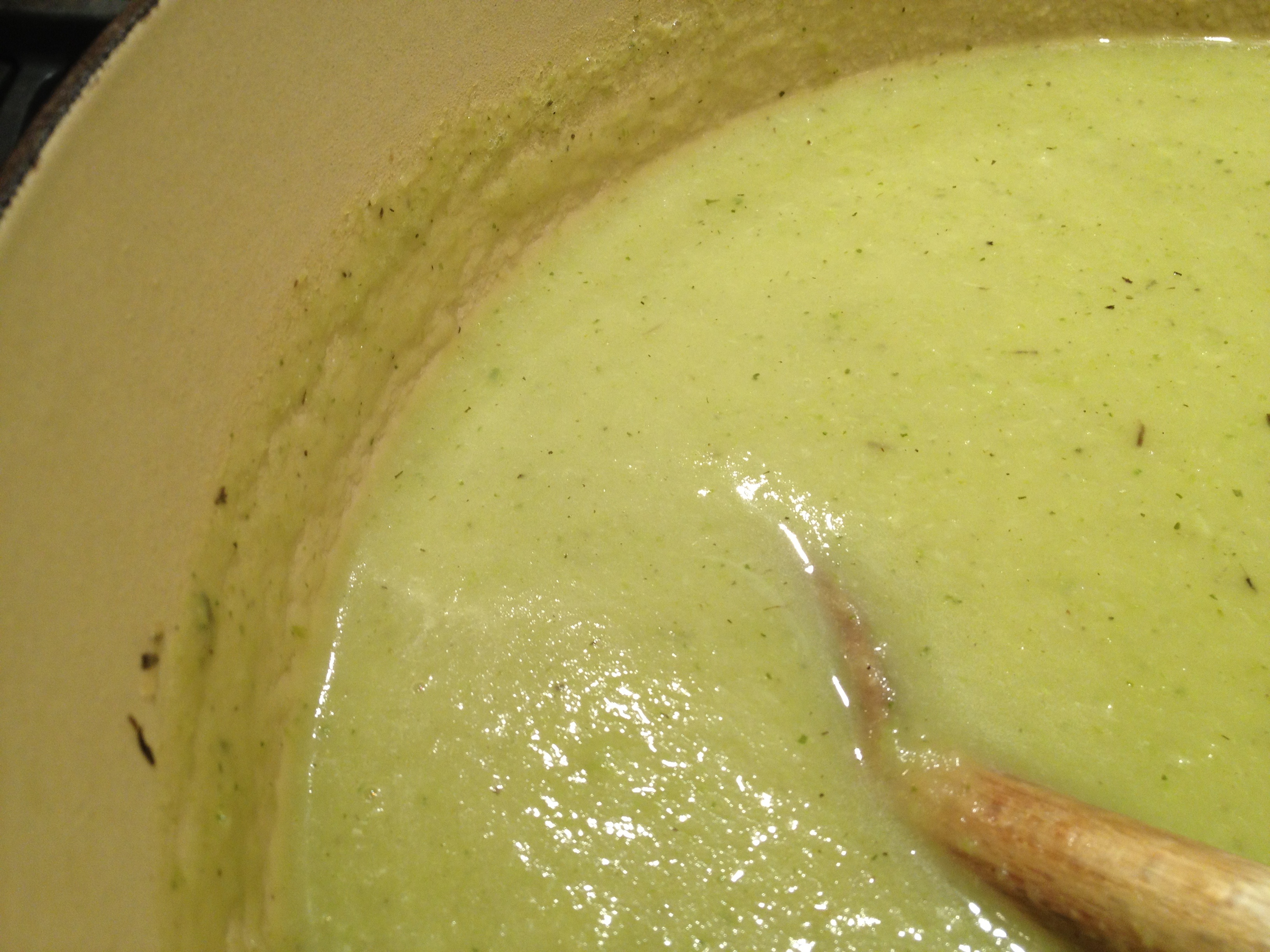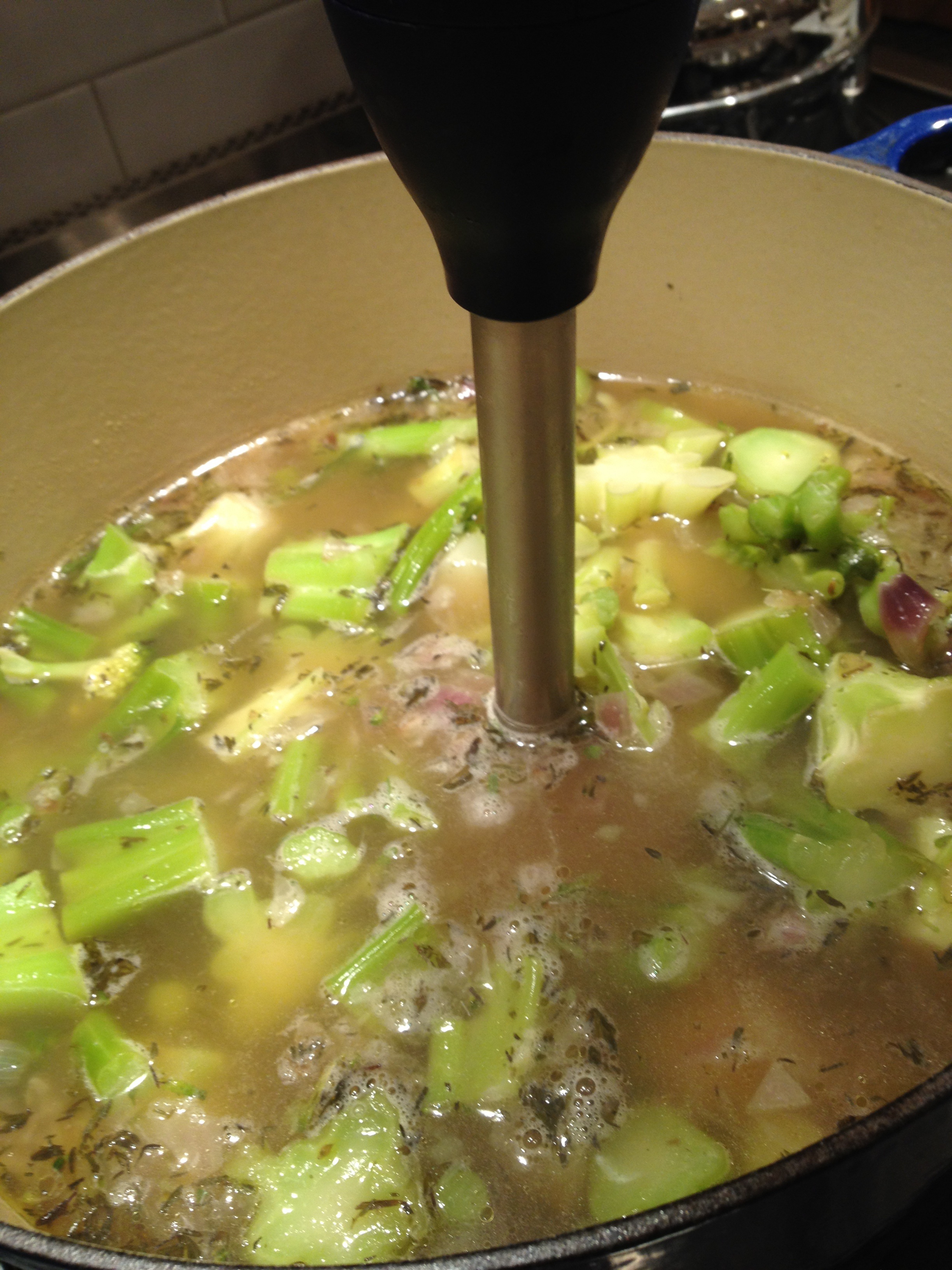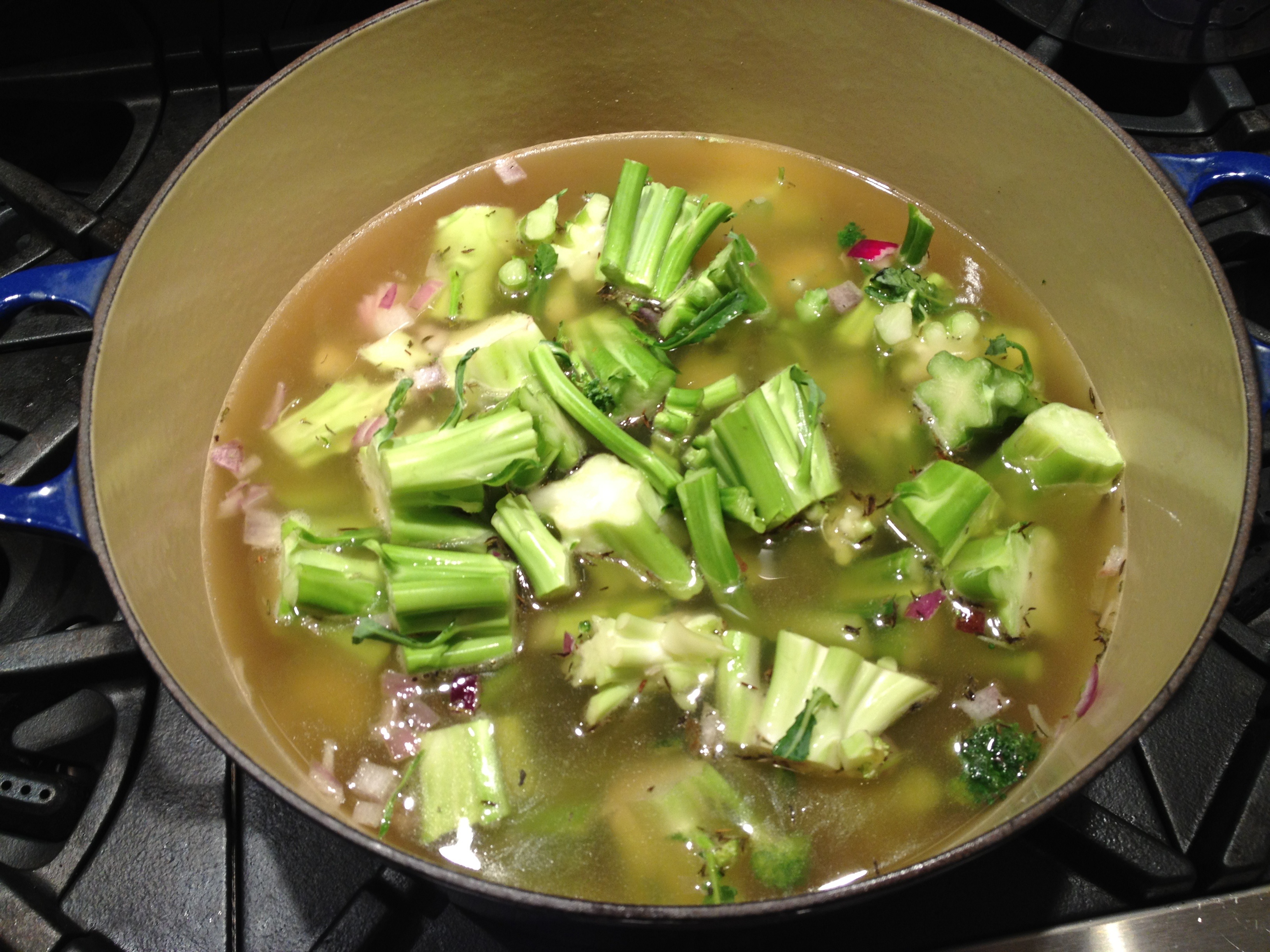 Using an immersion blender, purée the broccoli stalks until smooth. (Or, purée in small batches in a blender, covering the lid with a dishtowel to prevent splattering; add the purée back to the pot.)