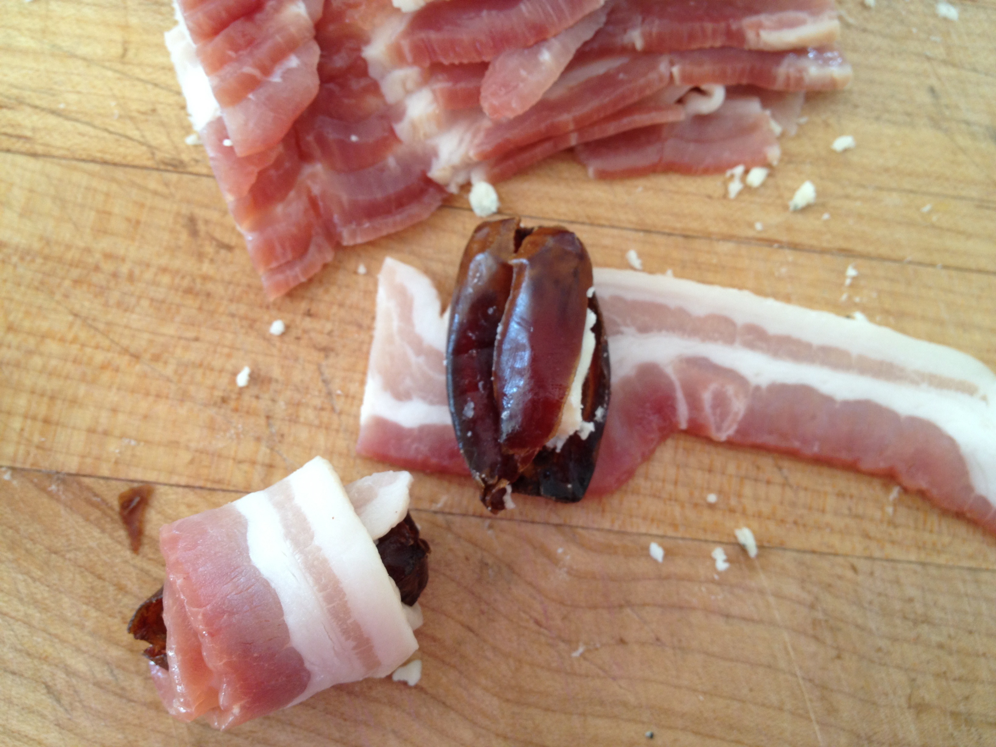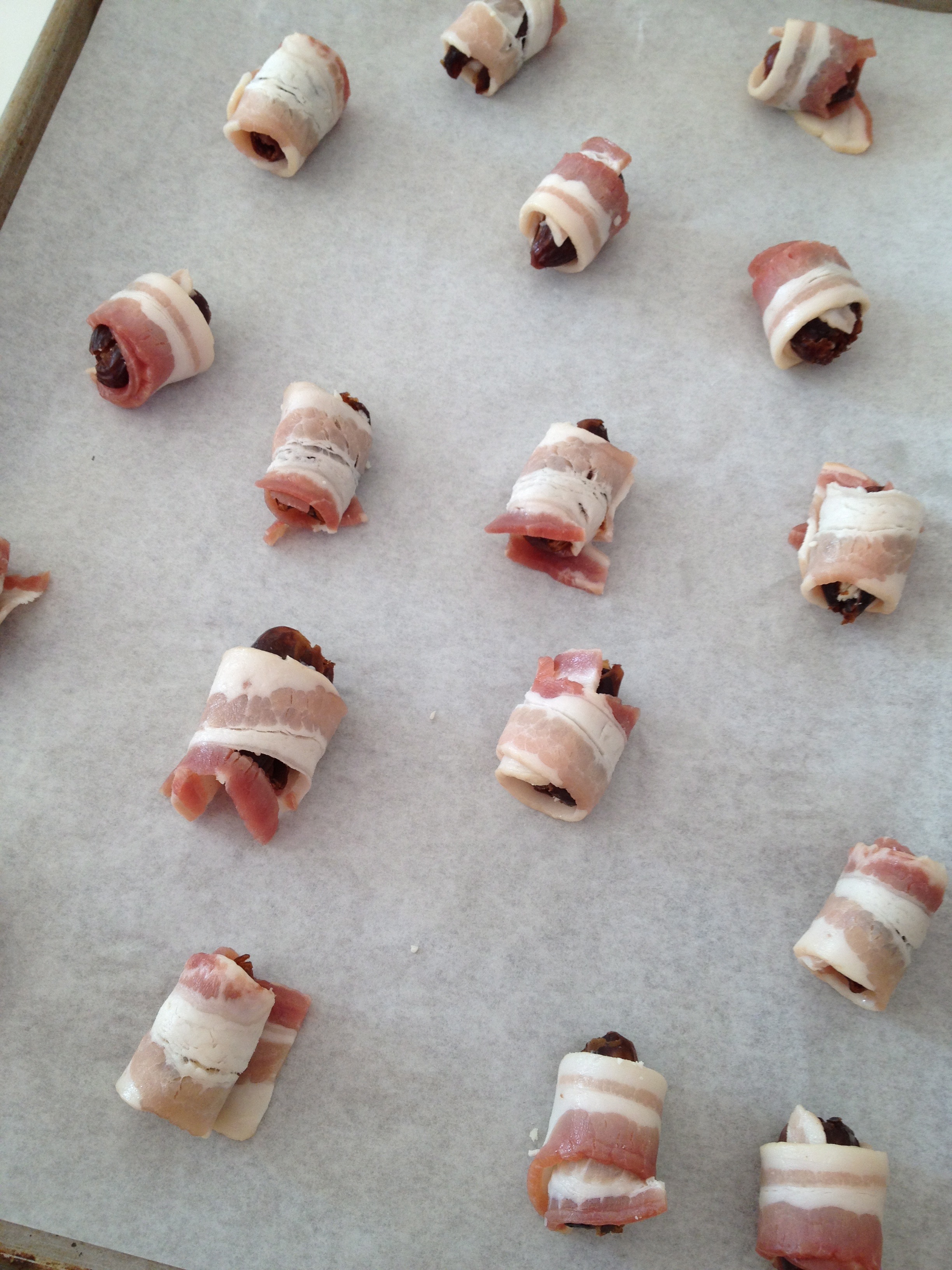 Tightly wrap the stuffed dates in bacon (the bacon’s stretchy so don’t be afraid to pull on it). Place seam-side down onto prepared baking sheet. (A lot of people use toothpicks to keep the bacon wrapped around the dates, but I find it’s unnecessary. I just sample any that might come unwrapped.)