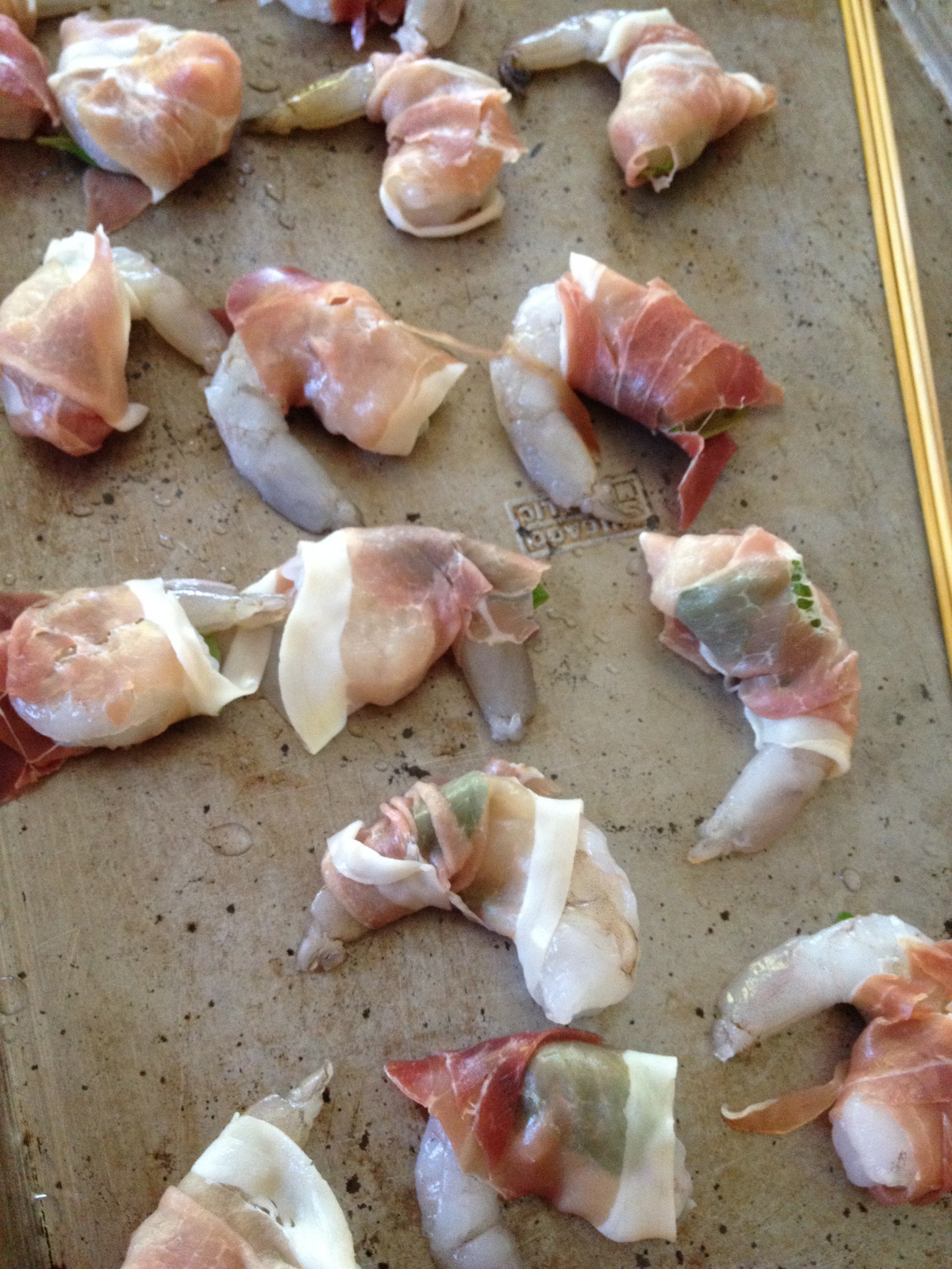 Arrange the ½ slices prosciutto out on a work surface. Place a basil leaf at the short end of each slice. Place a shrimp on top of the basil leaf and roll up tightly like a sleeping bag. (Or just hold in your hand and wrap like I usually do.) The prosciutto should be stretchy and slightly sticky, helping the shrimp bundle stay wrapped. Set onto a platter or baking sheet and repeat until all shrimp are wrapped.