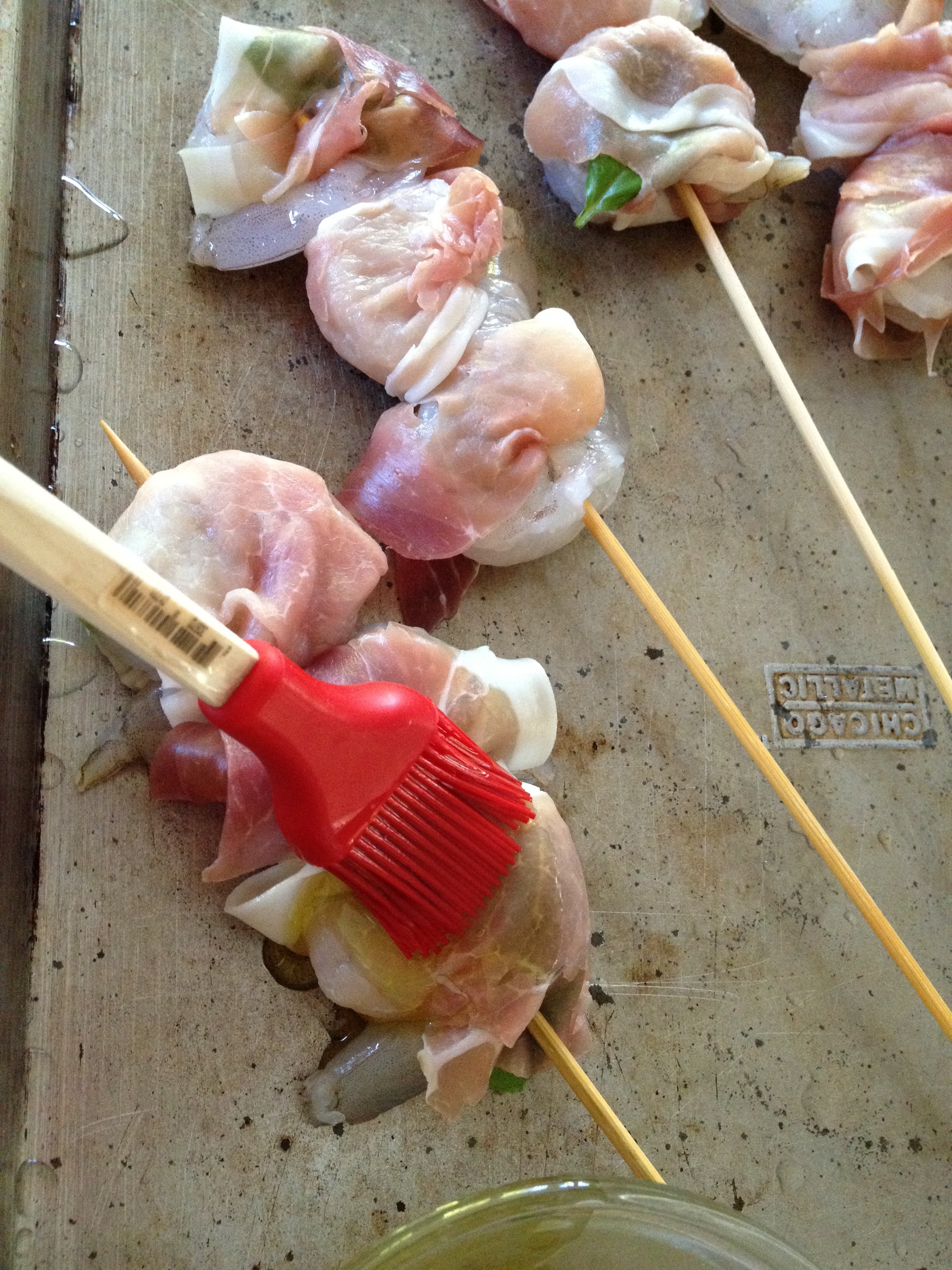 Need a quick but “wow” appetizer for a BBQ this weekend? These grilled shrimp bites are just the thing. You can prep the shrimp skewers and the sauce earlier in the day, or even a day ahead. When it’s party time, toss the skewers onto the grill and cook for a few minutes until the prosciutto is crisp and the shrimp have turned pink. Serve on a platter with the sauce alongside for dipping, or spoon some sauce onto small plates for an elegant first course. (I’ve even served the shrimp over pasta and called it dinner.)