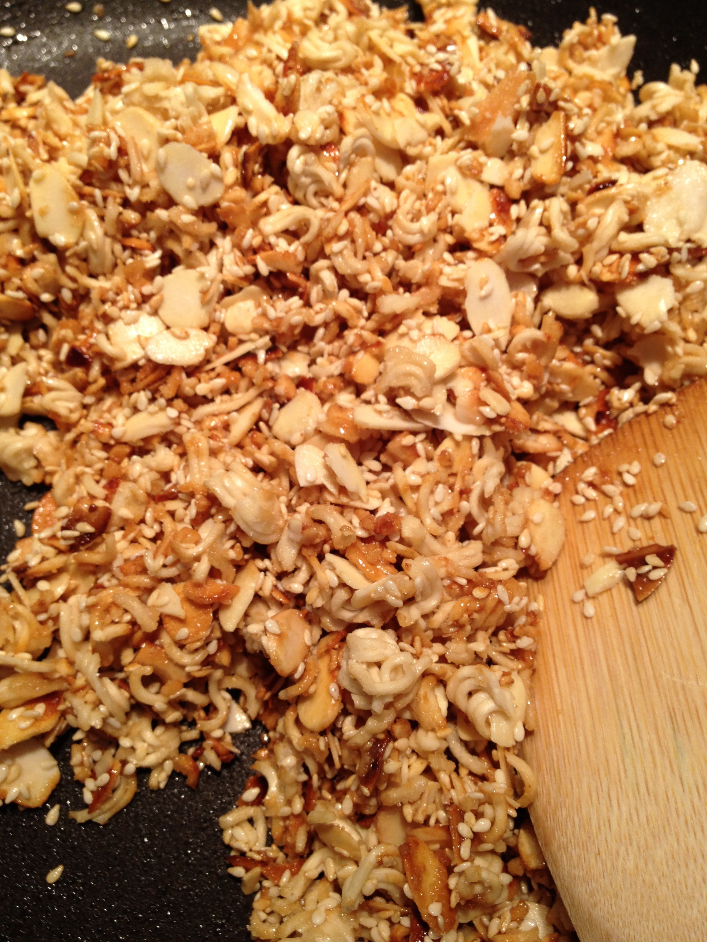Add crushed ramen noodles, almonds and sesame seeds (if using). Stir to coat and continue to cook until ramen and almonds are golden brown (about 5 minutes).