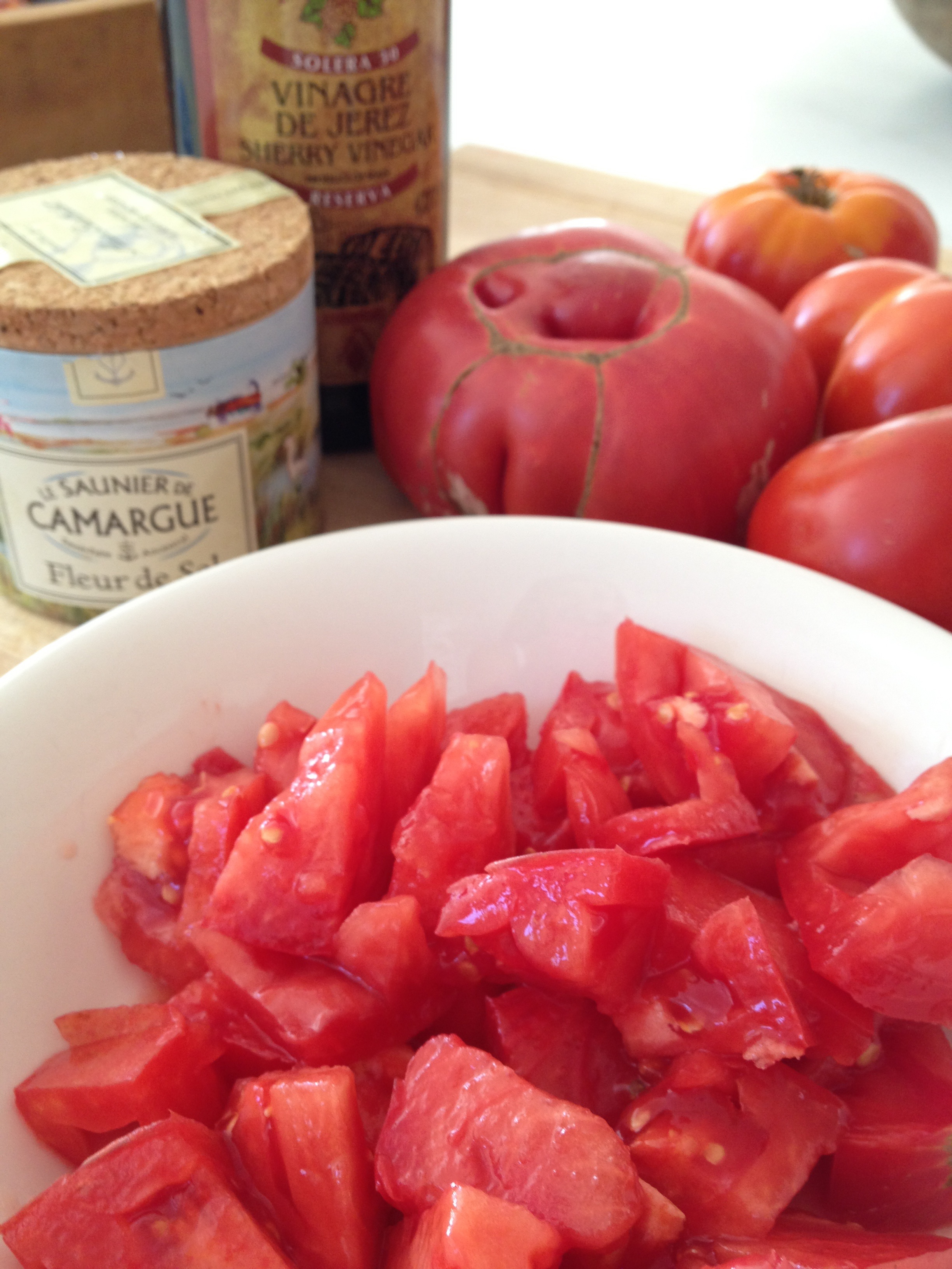 Coarsely chop tomatoes and sprinkle with 1/2 teaspoon kosher or sea salt. (To chop beefsteak tomatoes, I core and slice them with a serrated knife and then cut the slices into chunks.)