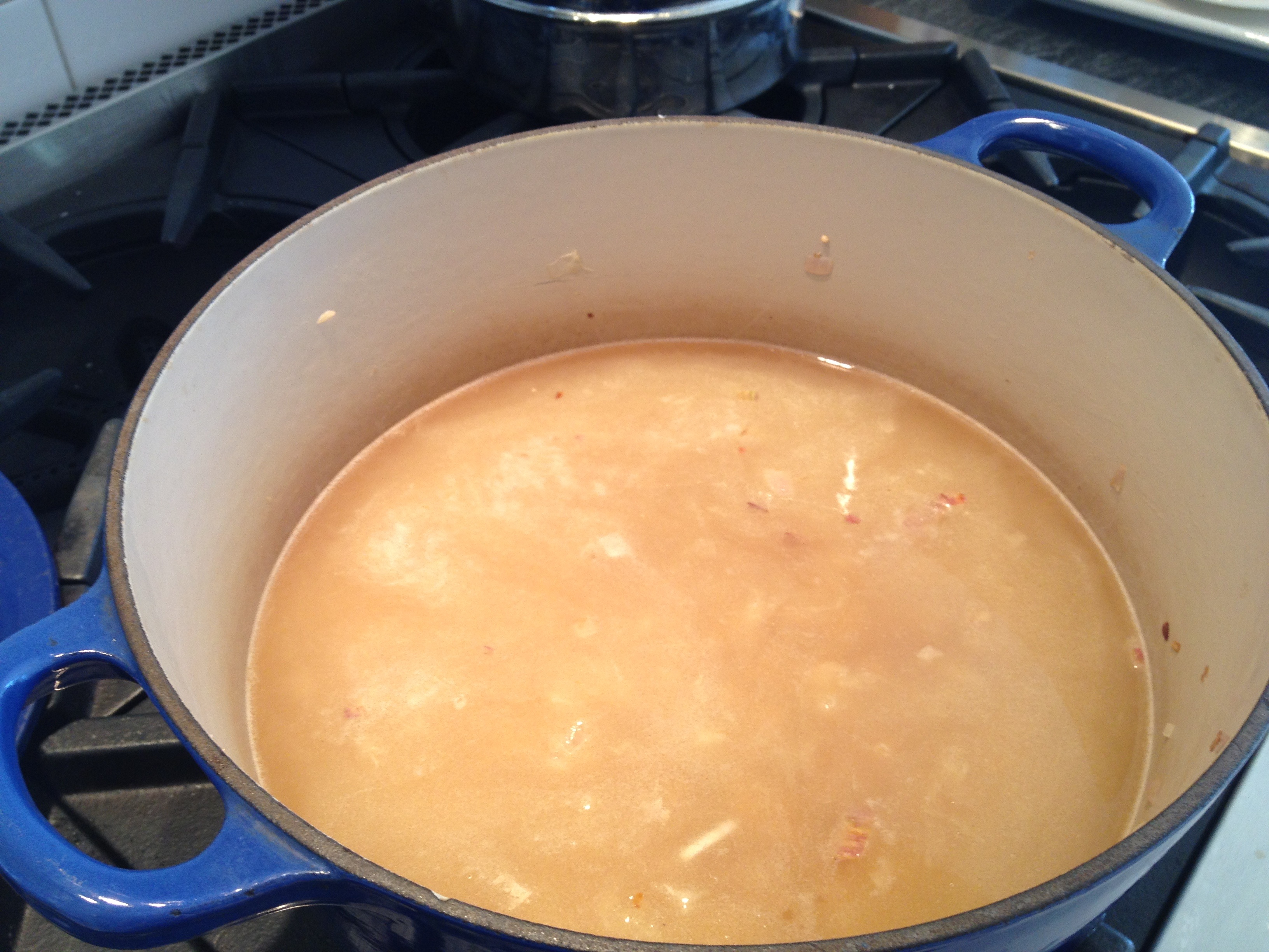 Add drained farro and sauté another minute or two. Add chicken broth and 1 ½ teaspoons kosher salt and bring mixture to a boil.