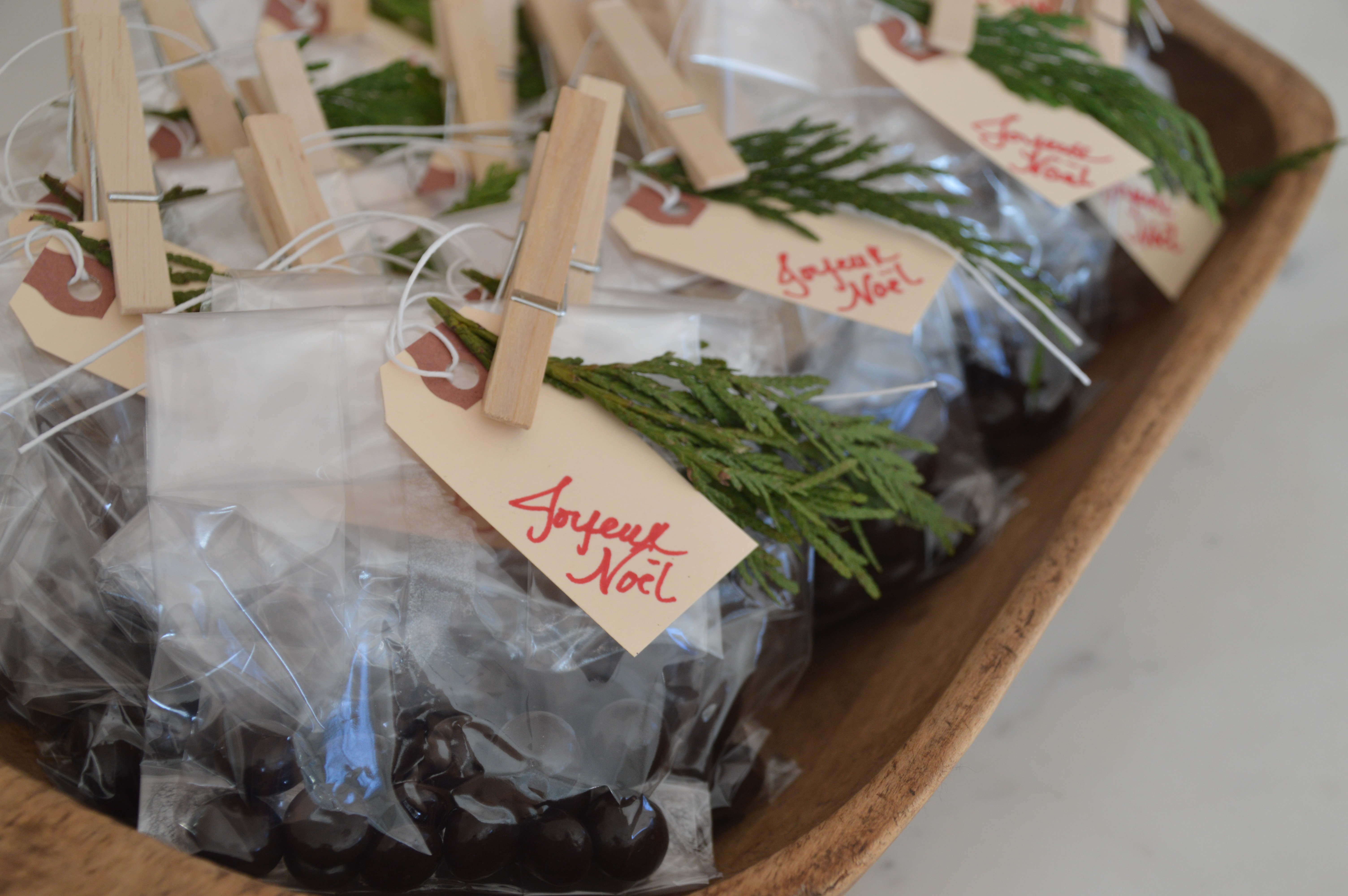 This year I thought I’d hand out favors to my guests as they left. (It’s what Martha would do, isn’t it??) In a perfect world with unlimited time, I would’ve baked and packaged homemade treats. But – I had to cut back somewhere. So I put a few dark chocolate pomegranate bites into little cello bags, then closed them up with clothes pins ($0.97 for 50 at WalMart) and some cedar sprigs. Festive, but not really French!