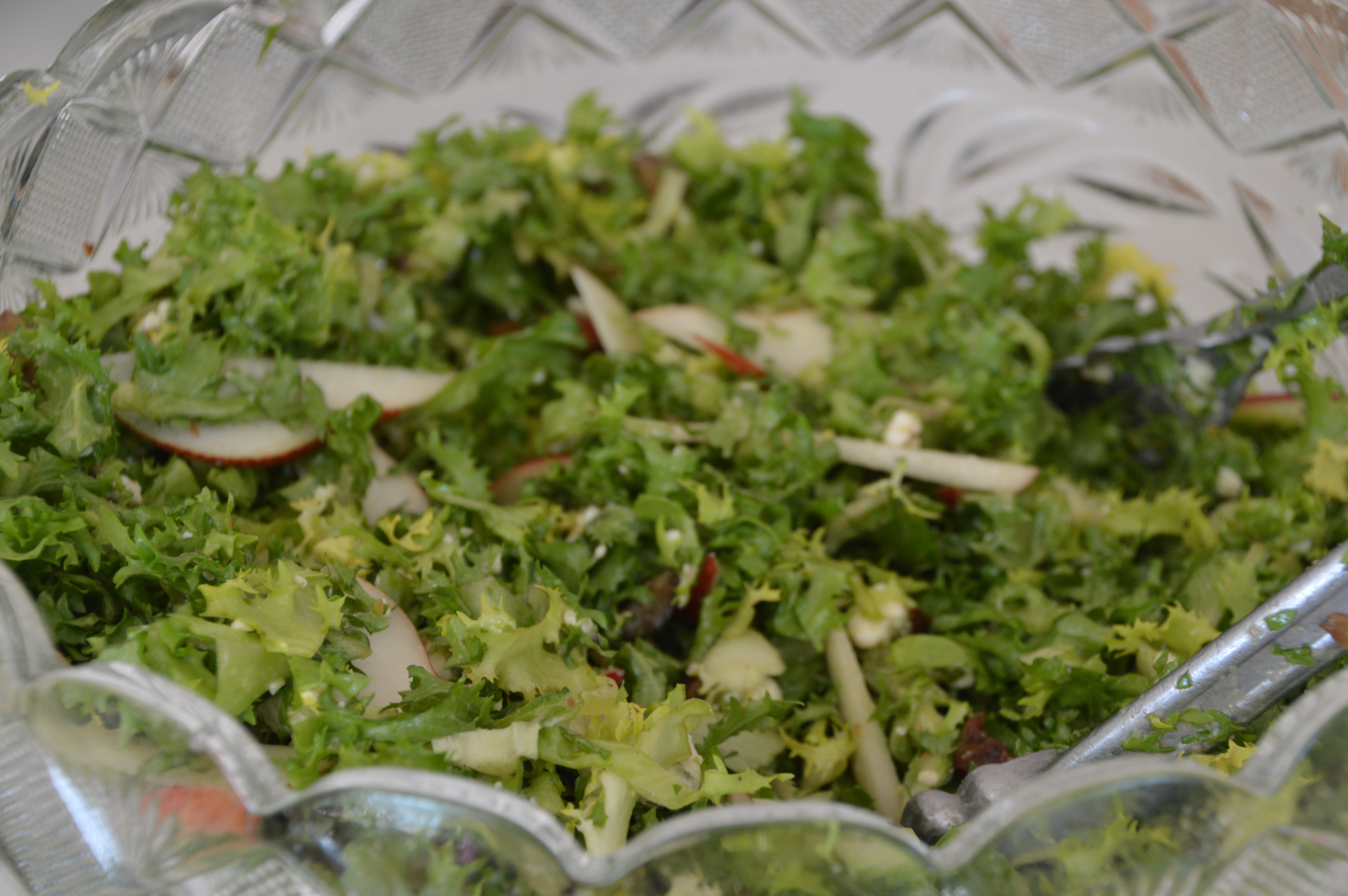 For my open house salad (served in a large punch bowl), I used 2 large heads of chicory/curly endive, 2 red bartlett pears (which weren’t quite ripe enough), a 20-oz bag of chestnuts, and 1/2 cup crumbled Maytag blue cheese. Chicory is a sturdy green, which held up to the dressing for 2 hours (until the salad disappeared). I made a triple batch of this recipe’s dressing, adding 1/4 teaspoon kosher salt and about a teaspoon of agave nectar to sweeten it a little. (I didn’t need to use all the dressing.)